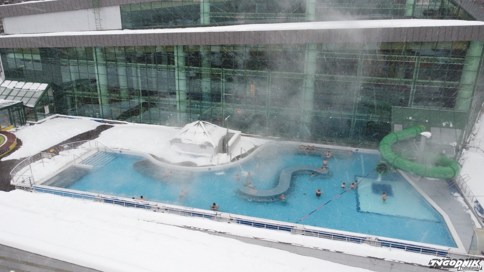Tak jak tu pod gołym niebem w zakopiańskich termach nikomu nie przeszkadza, że po głowie sypie śnieg.