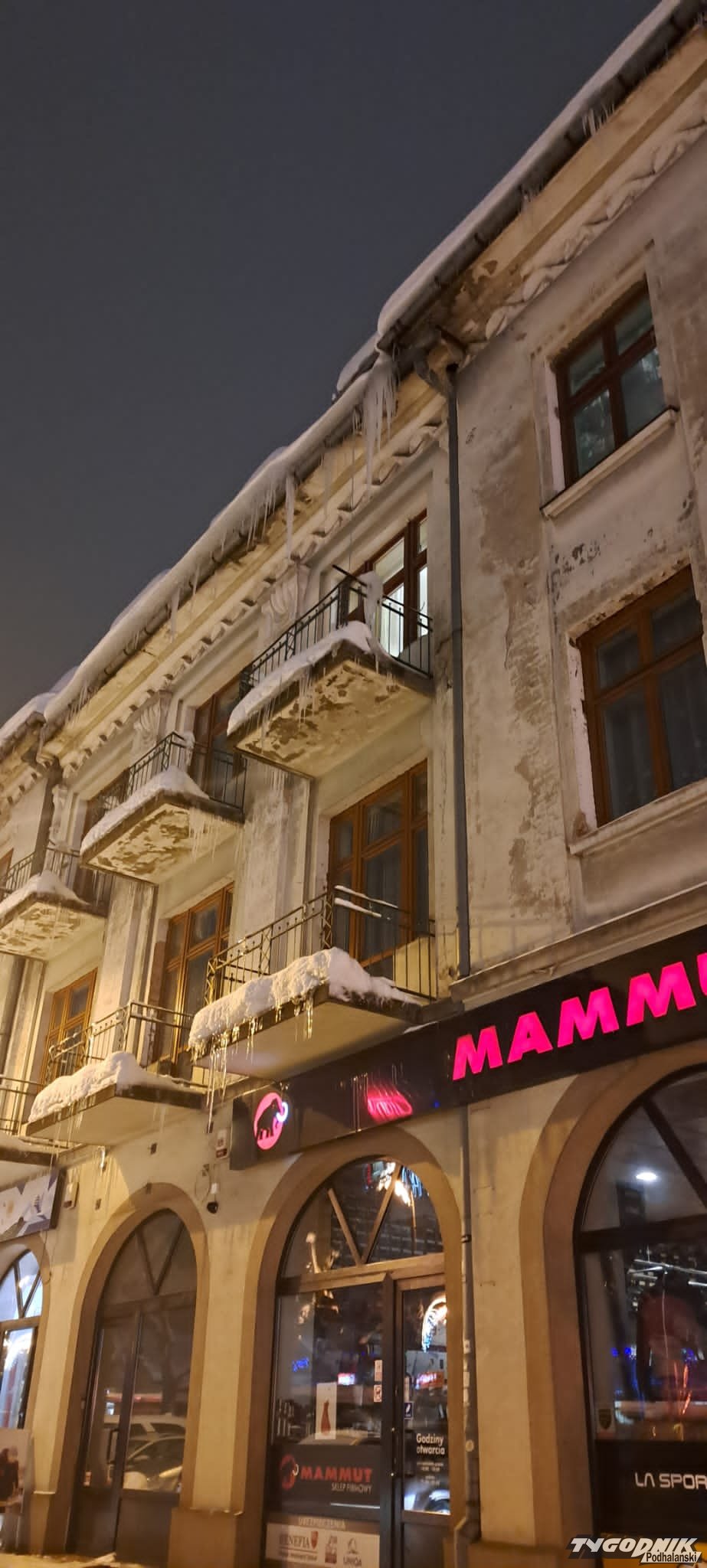 W rejonie Krupówek i ul. Kościuszki w kilku miejscach zalegają niebezpieczne nawisy śnieżne i sople.