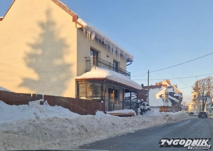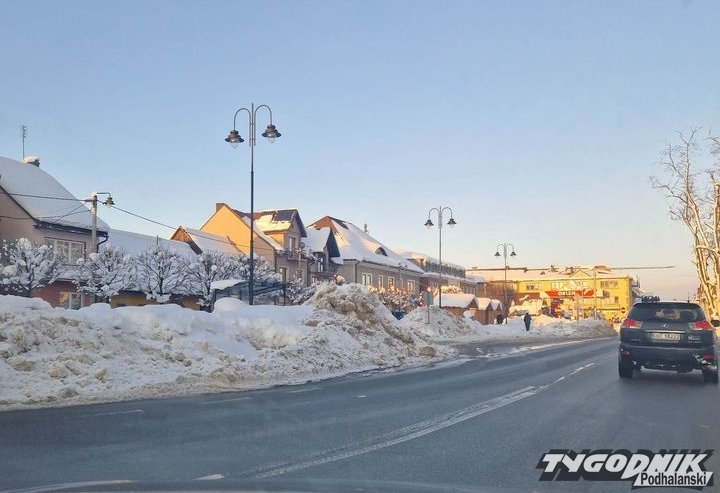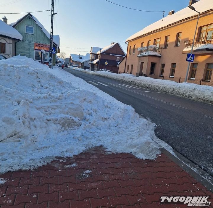 W okolicach poczty w Czarnym Dunajcu na chodnikach zalegają wielkie góry śniegu.