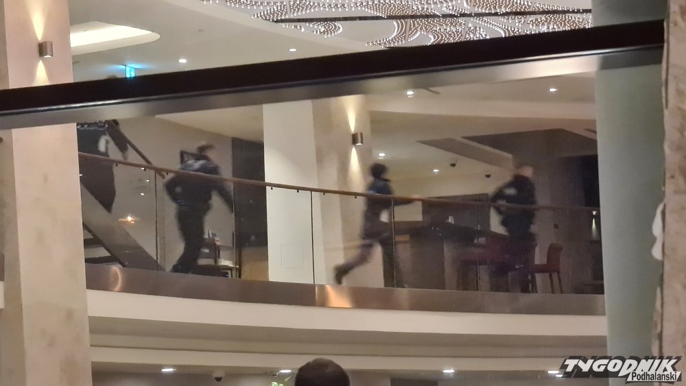 Do środka weszło kilkunastu policjantów ubranych w kamizelki kuloodporne. Z zewnątrz było widać, że ścigali mężczyzn po hotelowym holu i korytarzach. Najpierw dwóch z nich zostało zatrzymanych i skutych kajdankami. Później udało się zatrzymać pozostałych dwóch. Wcześniej w hotelu interweniowała ochrona. Na zewnątrz stało paru gości przyglądając się całej akcji przez szyby. Wyjście z hotelu zostało zamknięte. Ostatecznie jednak żaden z mężczyzn nie został zatrzymany, w czwartek mają wyjechać z hotelu. Policjanci ok. godz. 23 opuścili hotel.