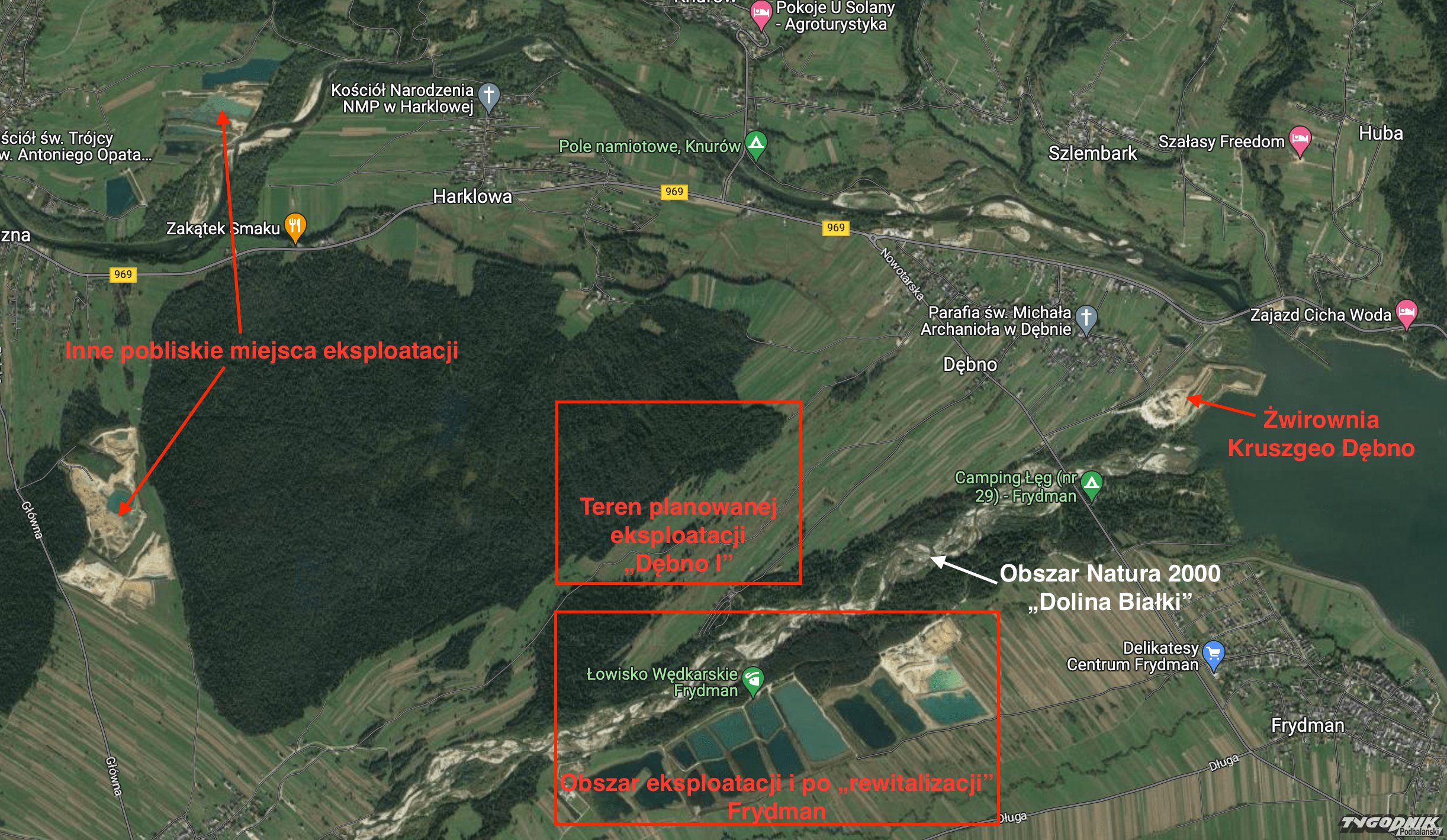 "Firma Kruszgeo zapewnia, że wydobycie będzie trwało przez okres max. 5 lat oraz że teren zostanie zrekultywowany, natomiast trzeba zaznaczyć, ze firma nie zrobiła nic, by swoją działalnością zbudować nasze zaufanie - wszyscy widzimy jak wygląda obszar eksploatacji złóż w pobliskim Frydmanie (dołączają zdjęcie satelitarne). Teren ten to kilka głębokich symetrycznych stawów wyrobiskowych, które są zarybiane, wokół stawów roztacza się iście księżycowy krajobraz. O rekultywacji terenu zdecydowanie nie można tutaj mówić, raczej o katastrofie ekologicznej, która ma miejsce tuż przy obszarze Natura 2000 "Dolina Białki". Ponadto nie ma żadnej gwarancji, ze wydobycie, zgodnie z obietnicami, będzie trwało 5 lat. Dzierżawa terenów pod żwirownie również miała się już dawno skończyć a niestety żwirownia stoi nadal. To wszystko sprawia, ze firma Kruszgeo w naszych oczach nie jest wiarygodna" - czytamy.