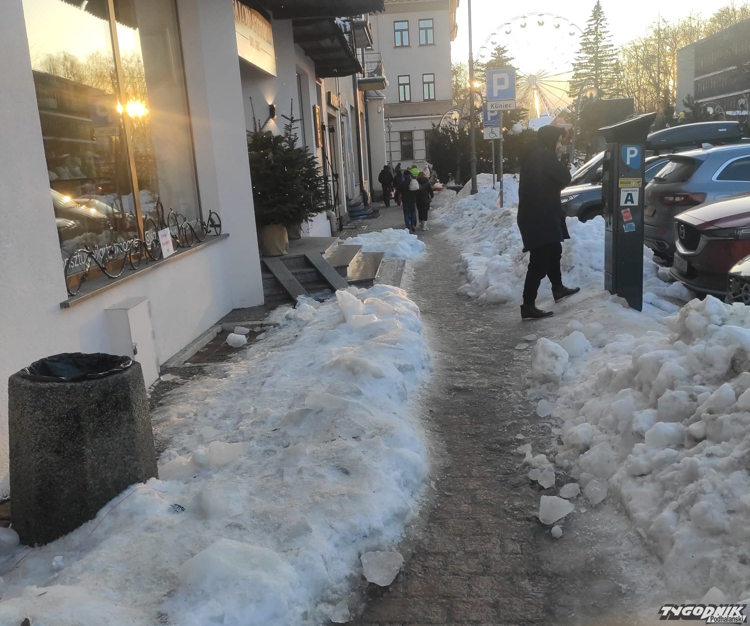 Mieszkaniec Zakopanego: "tak wygląda chodnik przed Związkiem Podhala. 30 cm wał ze śniegu i olbrzymie grudy lodów wszędzie porozwalane. Taka sytuacja jest praktycznie całą zimę".