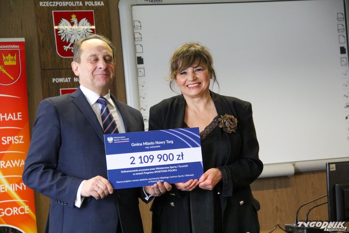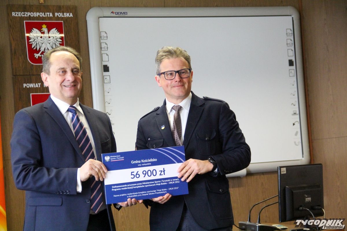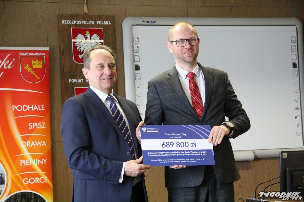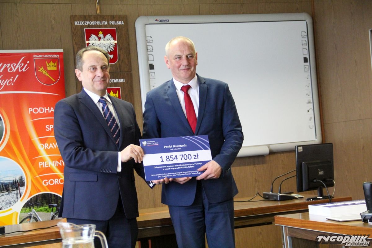 W siedzibie nowotarskiego starostwa Andrzej Gut- Mostowy podczas konferencji prasowej wręczył włodarzom podhalańskich gmin pieniądze na obiekty sportowe. W sumie to 10,4 mln zł. Większość, bo 8,5 mln zł trafi na Podhale z programu Sportowa Polska 2022, a reszta z programu modernizacji kompleksów sportowych Moje Boisko - ORLIK 2012.