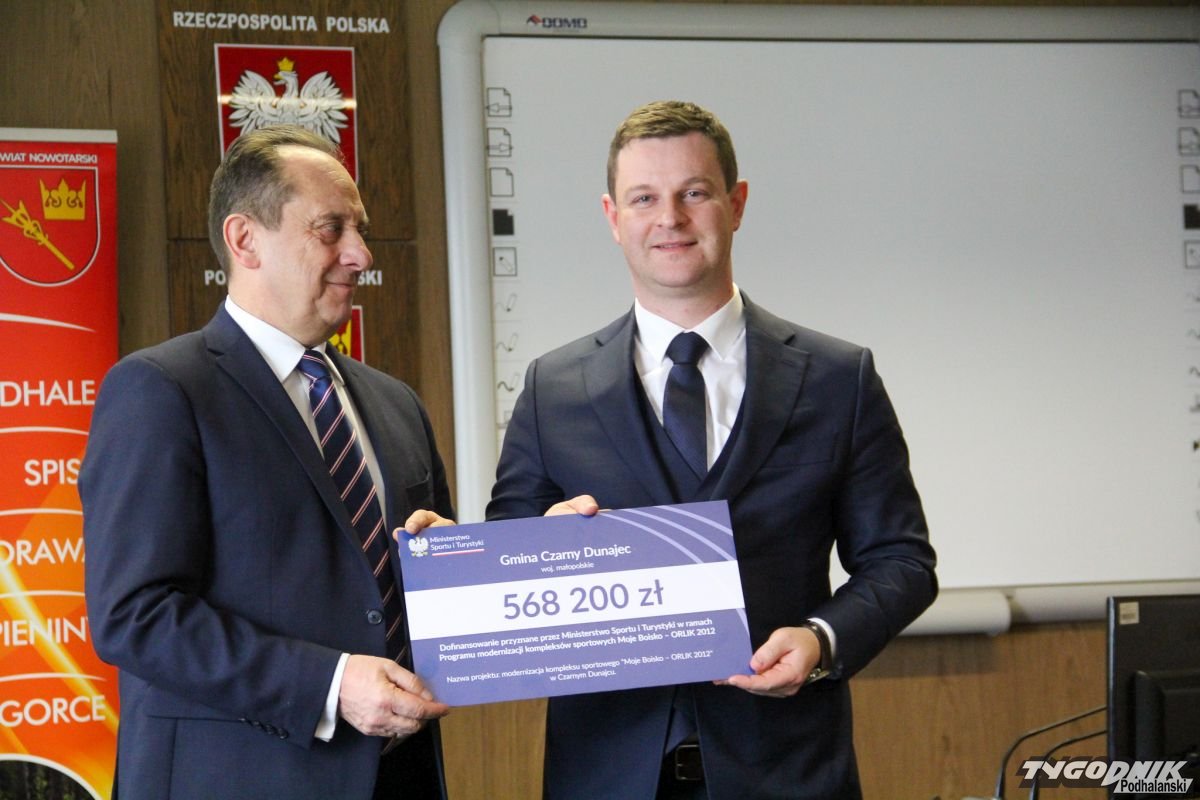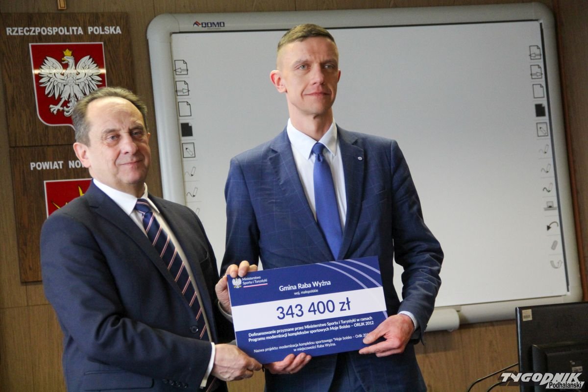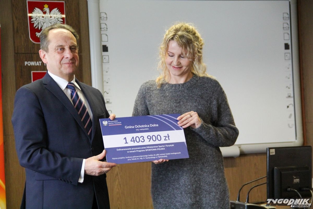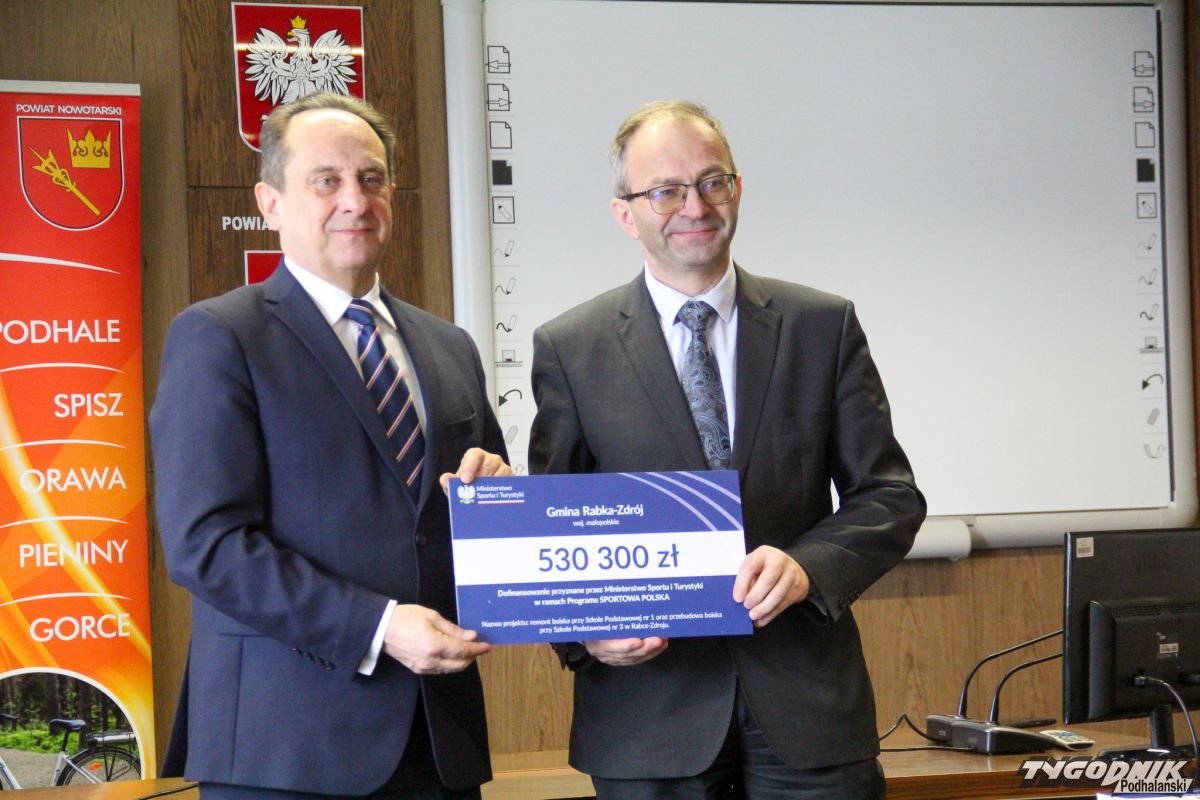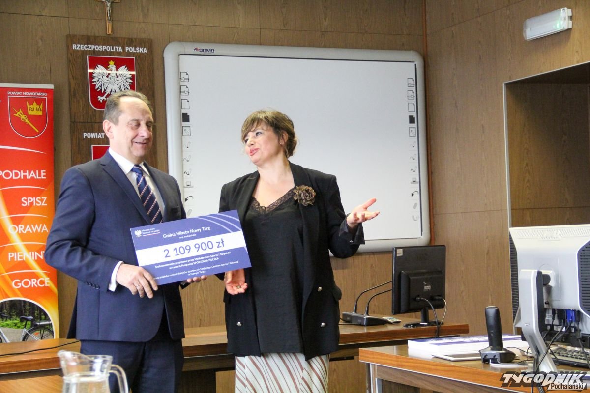 W siedzibie nowotarskiego starostwa Andrzej Gut- Mostowy podczas konferencji prasowej wręczył włodarzom podhalańskich gmin pieniądze na obiekty sportowe. W sumie to 10,4 mln zł. Większość, bo 8,5 mln zł trafi na Podhale z programu Sportowa Polska 2022, a reszta z programu modernizacji kompleksów sportowych Moje Boisko - ORLIK 2012.