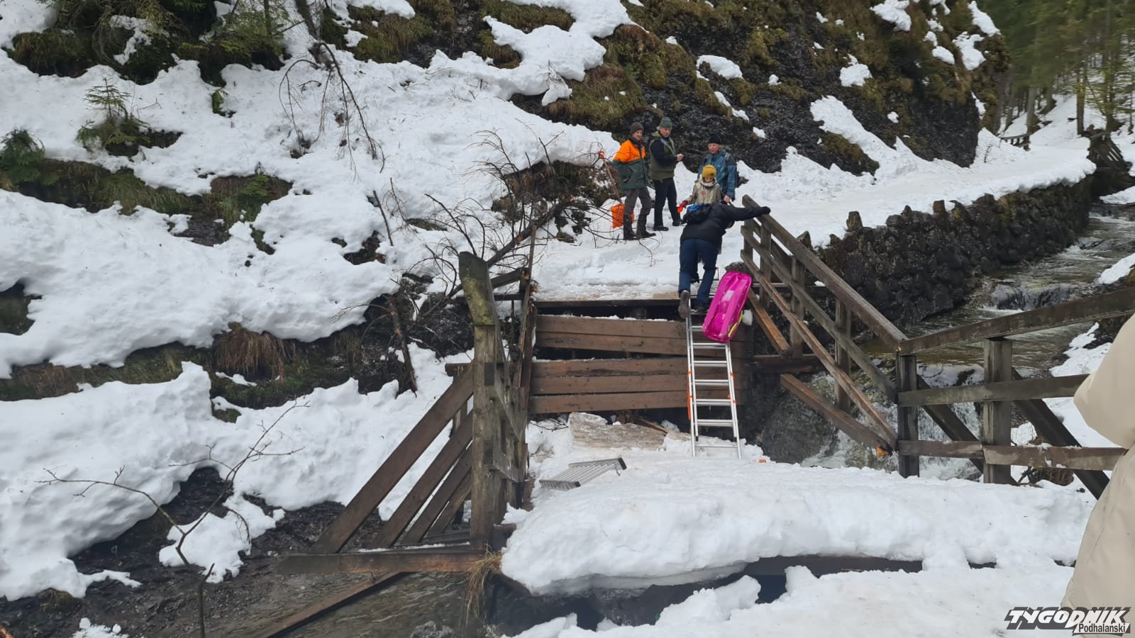 Przeprawa położona w popularnej wśród turystów reglowej dolinie zawaliła się pod naporem mokrego śniegu. Na miejsce dotarli już pracownicy Tatrzańskiego Parku Narodowego, którzy z drabinki zbudowali prowizoryczną przeprawę i przepuszczają po niej turystów powracających z wycieczki.