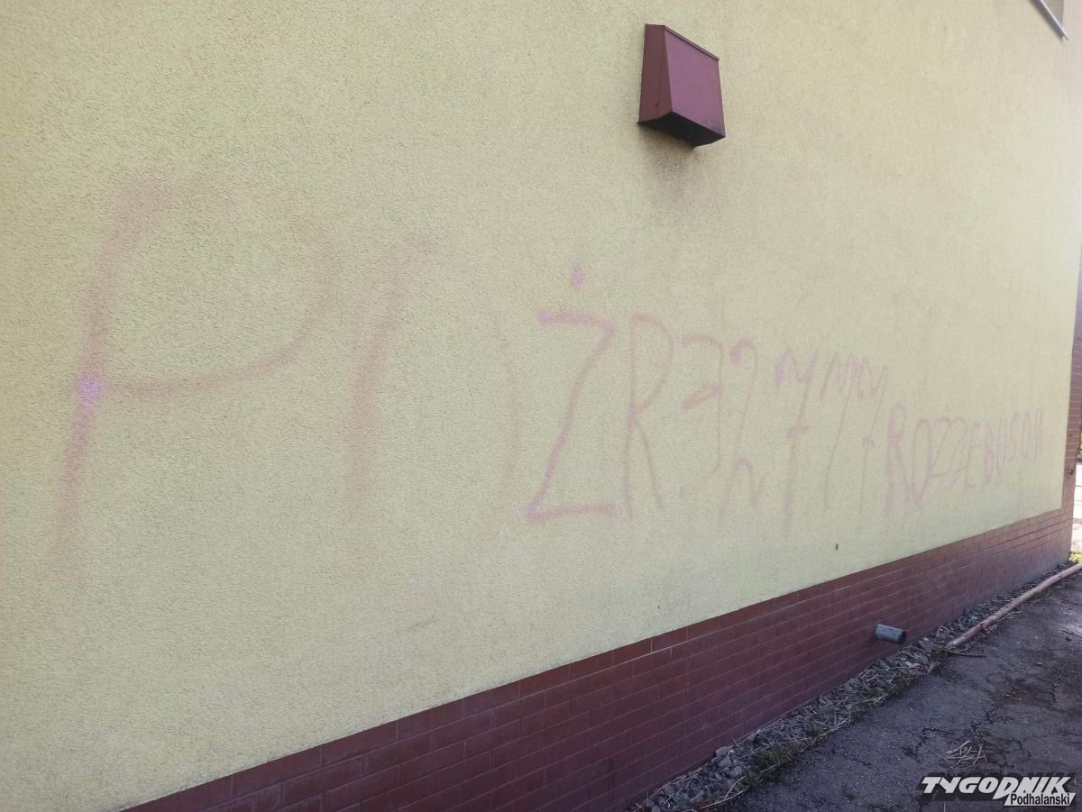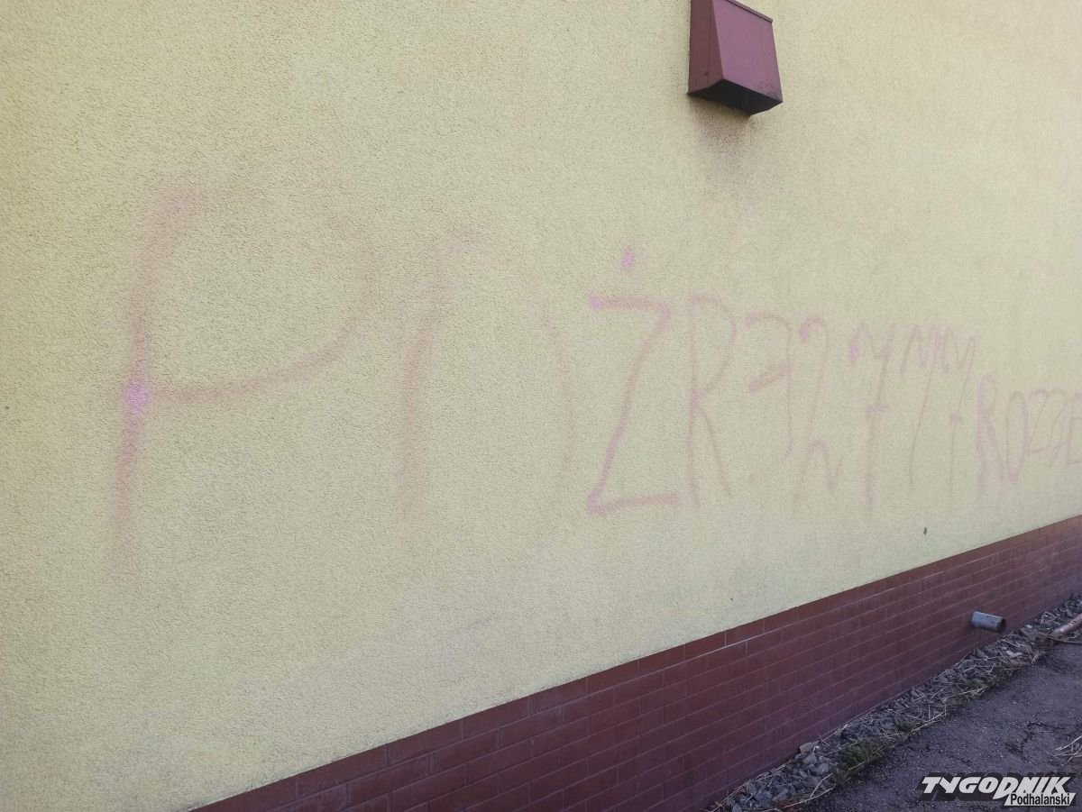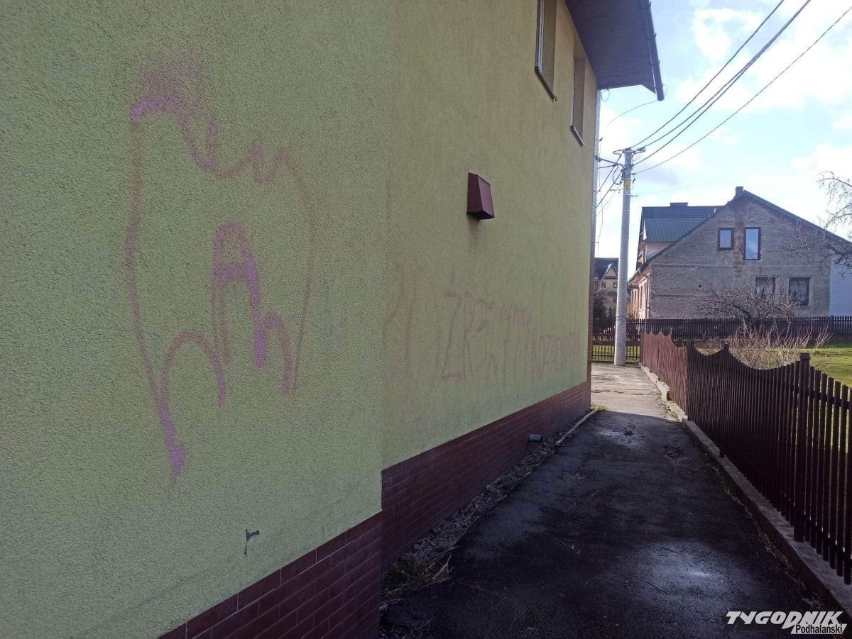 Strażacy OSP Sidzina dają wandalowi czas do jutra, żeby sam się zgłosił i wyczyścił zniszczoną elewację.