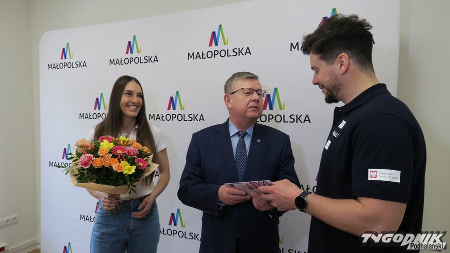 "Czekoladowy" czek na tysiąc euro dla Oskara Kwiatkowskiego i piękny bukiet kwiatów dla Aleksandry Król wręczył wraz z gratulacjami marszałek Witold Kozłowski.