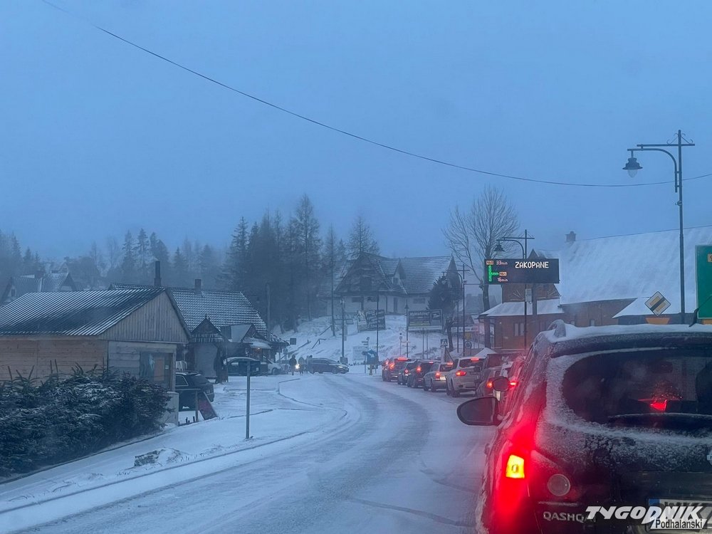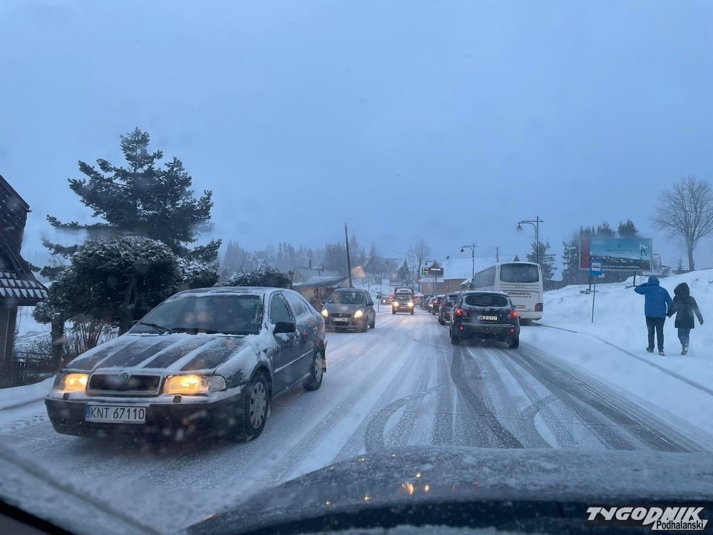 Od dwóch godzin na Podhalu sypie śnieg. Trudne warunki panują m. in. na podjazdach w Bukowinie, z Nowego Bystrego do Zębu (tam interweniowała policja, wezwano służby odpowiedzialne za odśnieżanie). Kłopoty mają też kierowcy na stromym podjeździe przez Salamandrę w Kościelisku w kierunku Gubałówki. Zatory tworzą się też na zakopiance. Taka pogoda ma się utrzymać jeszcze przez kilka godzin. Opady zaczną zanikać ok. godz. 20.