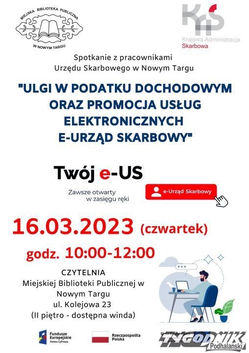 Miejska Biblioteka Publiczna w Nowym Targu zaprasza w czwartek 16.03 na spotkanie konsultacyjne dla podatników dotyczące ulg w podatku dochodowym oraz usług elektronicznych.