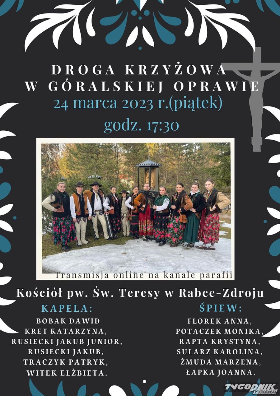Chętnych do wzięcia w niej udziału organizatorzy zapraszają do kościoła pw. św. Teresy na godzinę 17.30. Wyruszycie ku kolejnym stacjom przy muzyce kapeli w składzie: Dawid Bobak, Katarzyna Kret, Jakub Rusiecki junior, Jakub Rusiecki, Patryk Traczyk i Elżbieta Witek Śpiewać będą: Anna Florek, Monika Potaczek, Krystyna Rapta, Karolina Sularz, Marzena Żmuda i Joanna Łapka.