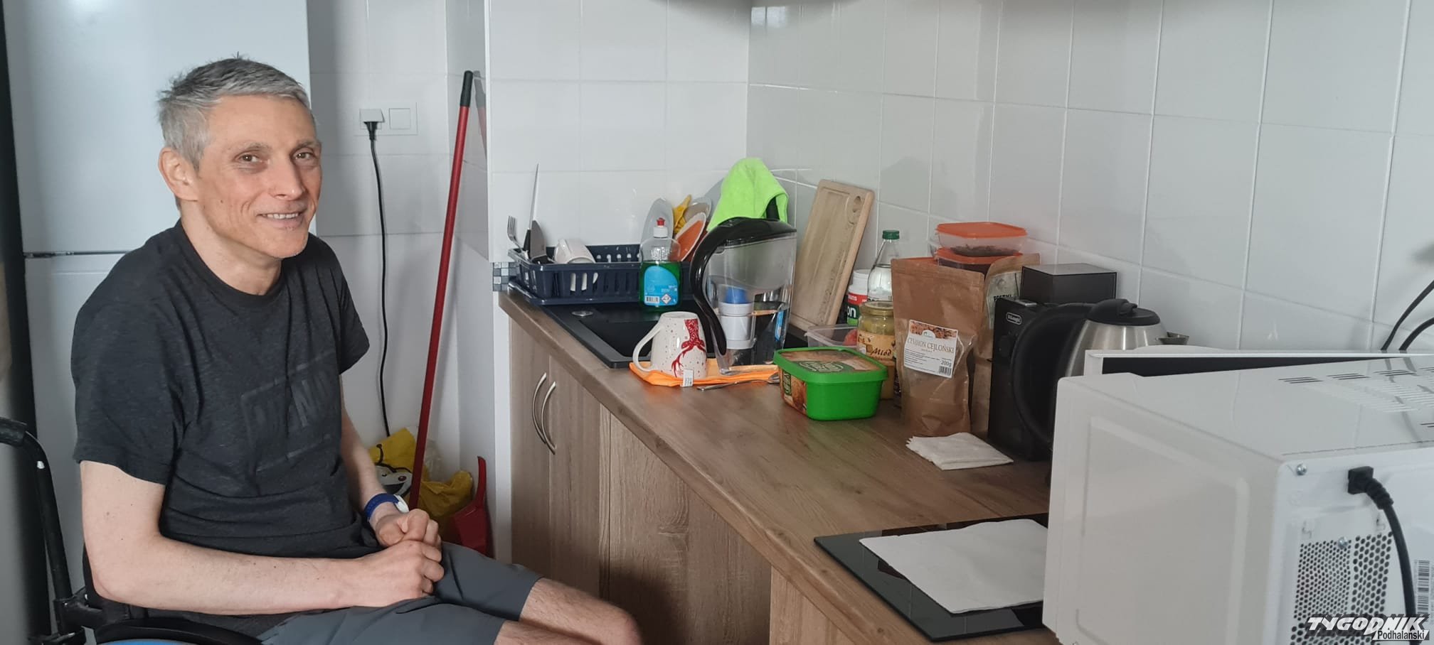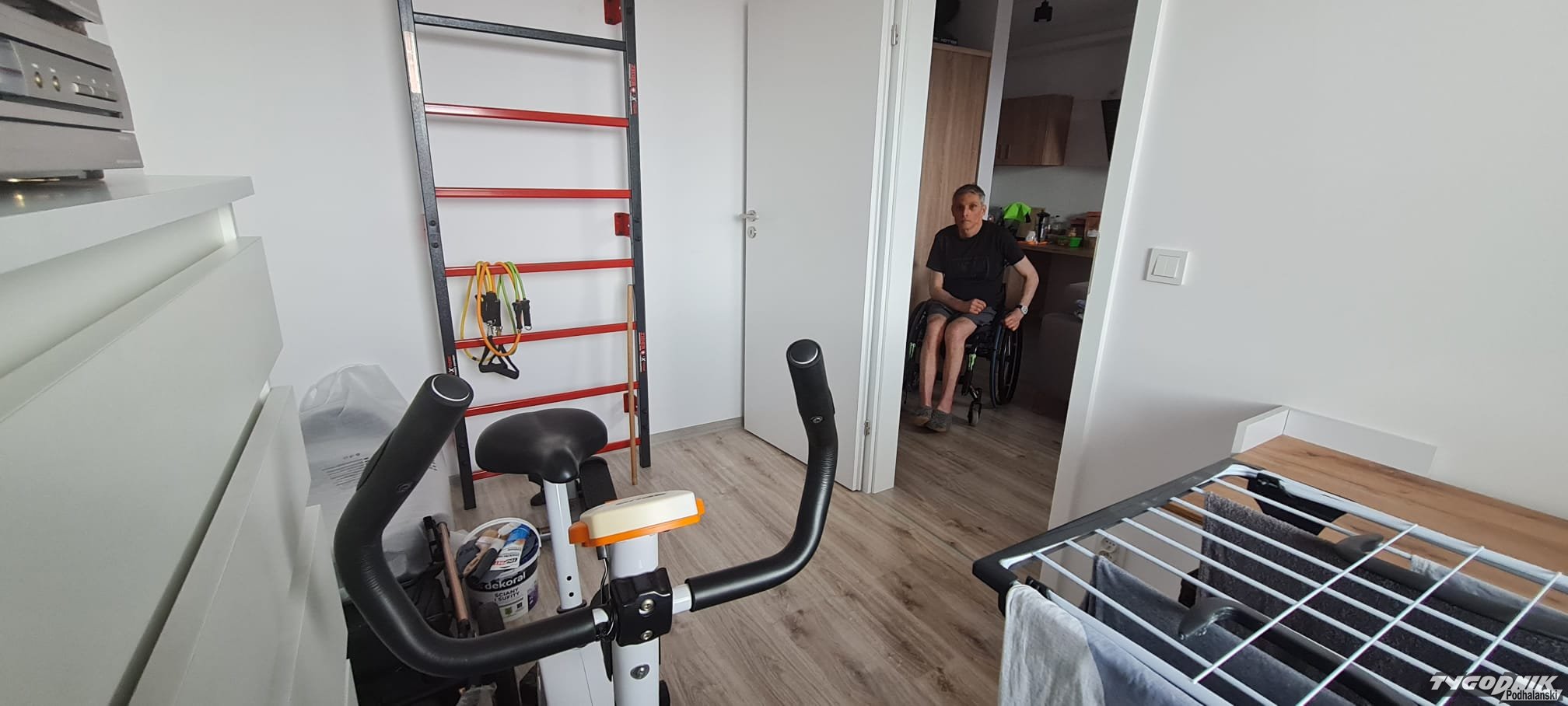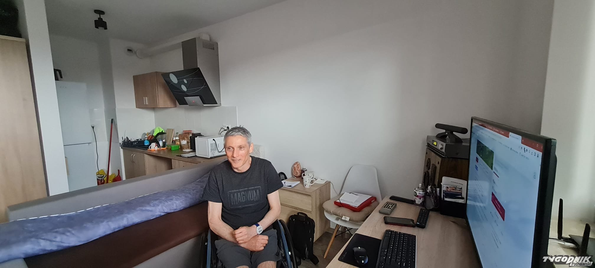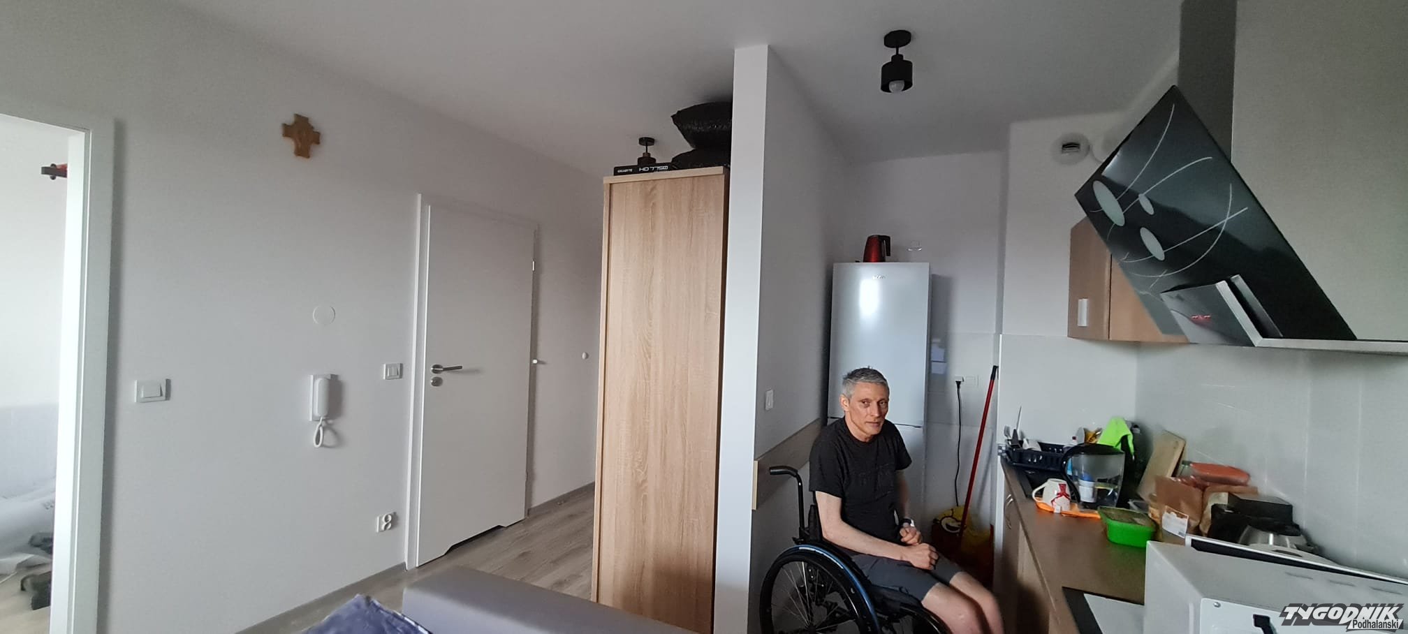 Choć klucze od własnego mieszkania dostał w lipcu zeszłego roku, wprowadził się do niego dopiero przed miesiącem. Dokładnie 15 lutego. Od tego czasu nie opuścił swoich czterech ścian, bo nie pozwala na to jego wózek inwalidzki, poruszany siłą jego mięśni. Podczas dłuższej niż po mieszkaniu jazdy ktoś musi ten wózek popchnąć.