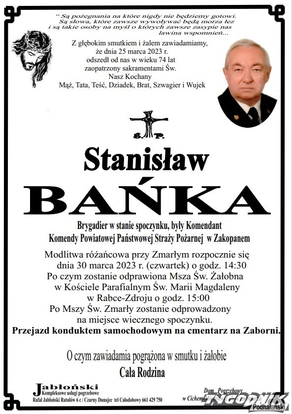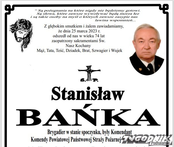 Stanisław Bańka, brygadier w stanie spoczynku, były Komendant Powiatowy Państwowej Straży Pożarnej w Zakopanem zmarł 25 marca w wieku 74 lat.