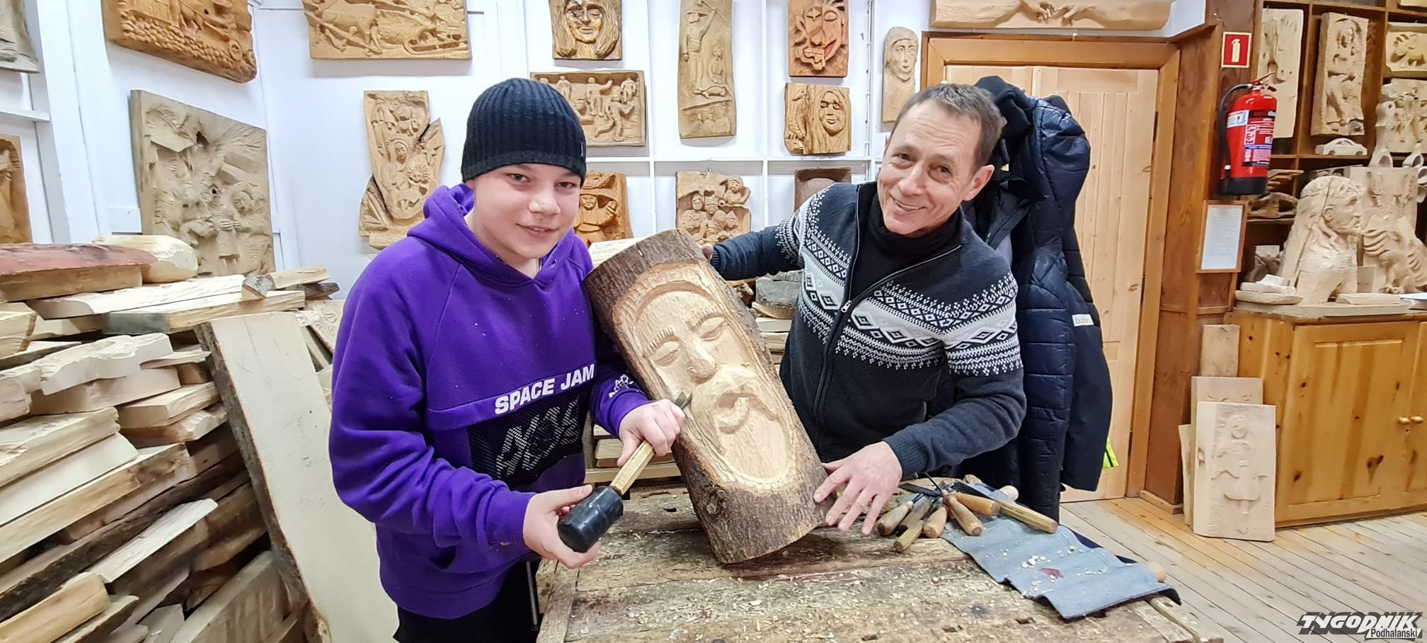 Jasiek interesuje się historią. rzeźbi karabin z drugiej wojny światowej. Kacper wykłuwa dłutem w drewnie dom. Nicola szkicuje smoka, a Amelka rzeźbi tulipana dla mamy. Alan pracuje nad projektem płaskorzeźby. Zdradza, że będzie to utrwalony mem z internetu, postać z Uno, gry planszowej. Bartek walczy z ogromnym klocem drewna, z którego powoli wykluwa się postać starca. - Wszyscy zaczynają od misek, żeby nabrać wprawy, zaprzyjaźnić się z dłutem, poznać technologię drewna - opowiada doświadczony nauczyciel. Gdy młodzi artyści nabiorą sprawności manualnej - kolejnym etapem jest praca nad płaskorzeźbą, a potem dopiero nad formą przestrzenną. - Pan Marek jest wymagający, ale zarazem ma dla nas dużo cierpliwości - podkreśla Nicola. - Pomaga przy pracy, podsuwa nam pomysły, ale też pozwala wykonywać rzeźby według naszych pomysłów, związane z naszymi własnymi pasjami - mówi miłośniczka smoków.