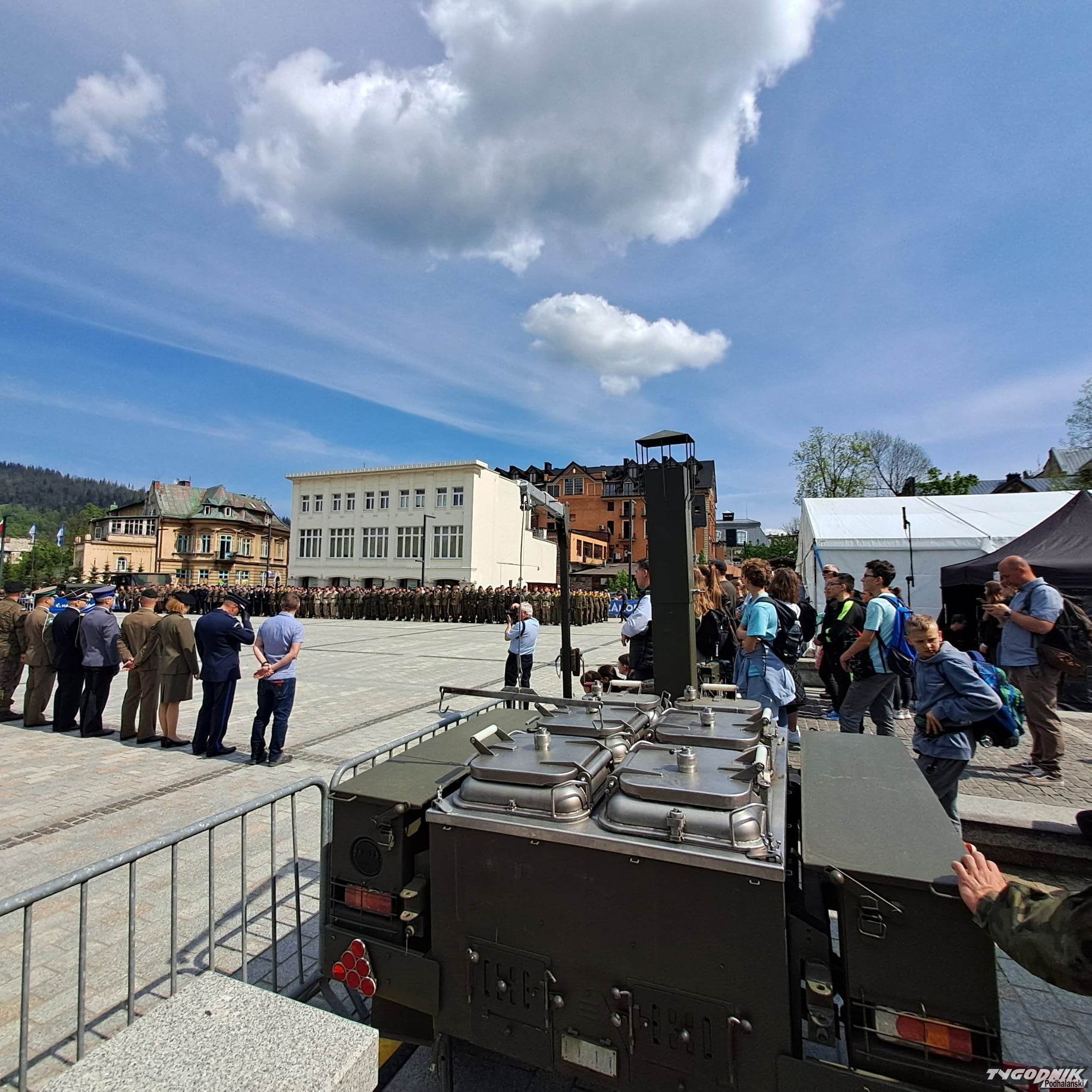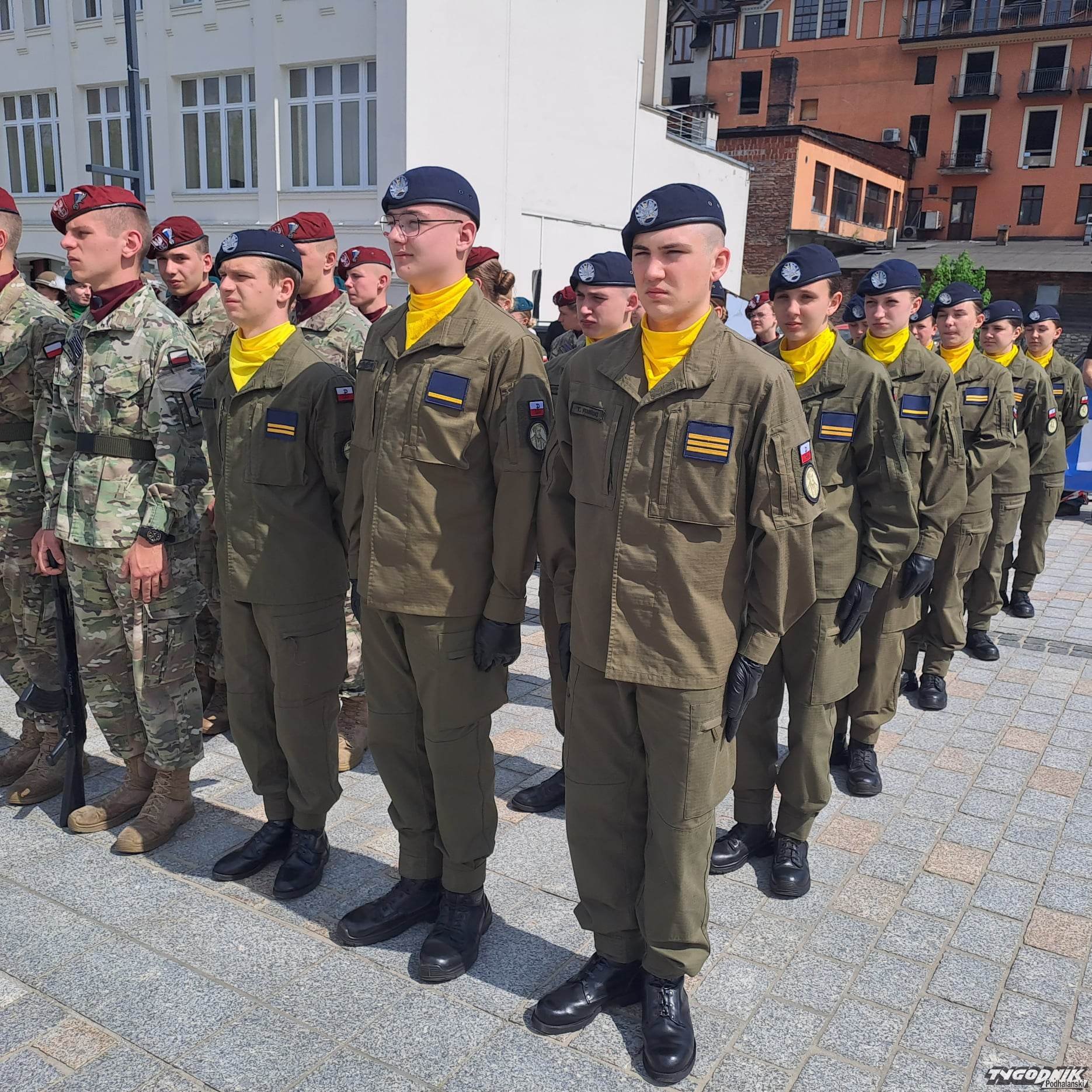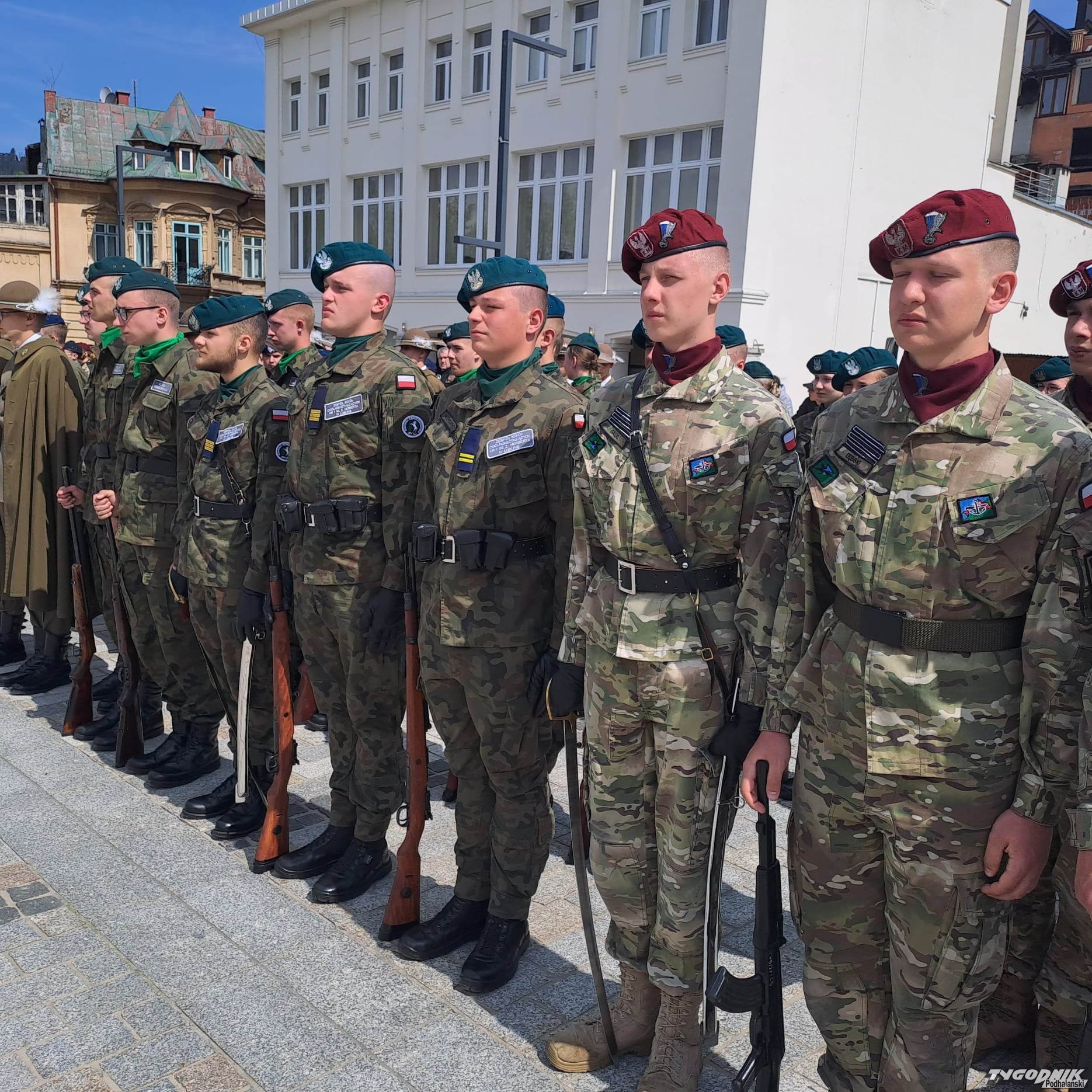 Na Placu Niepodległości uczniowie z mundurowych klas prezentują się z jak najlepszej strony. Defilują, śpiewają żołnierskie pieśni. Oglądają ich różne vipy. Dojechała Małopolska Kurator Oświaty Barbara Nowak, są władze samorządowe.