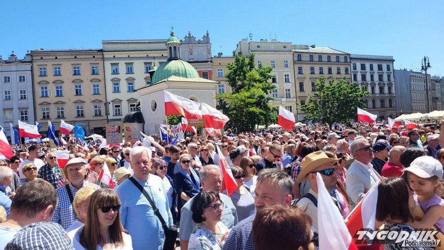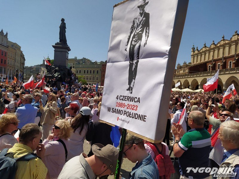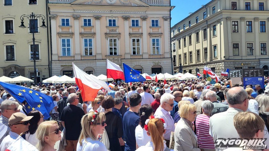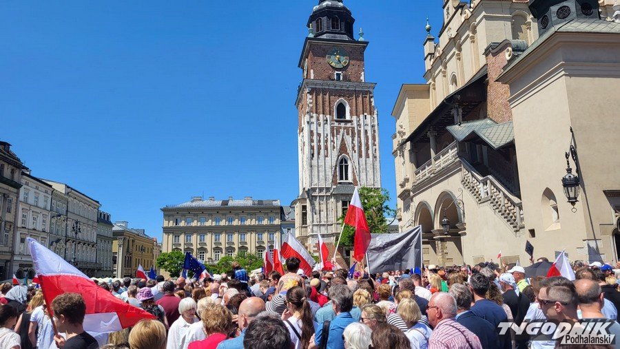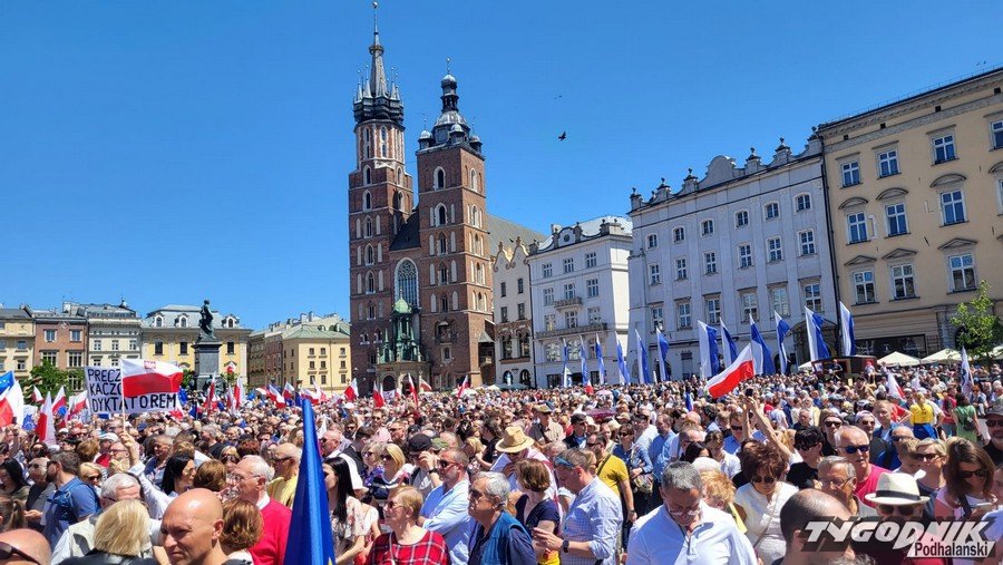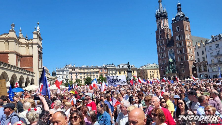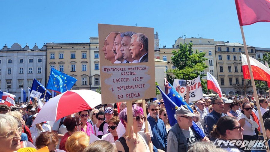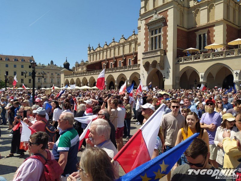 Biało-czerwone flagi i błękitne barwy Unii Europejskiej, trochę transparentów z hasłami typu "Precz z kaczorem dyktatorem", "PiS komuna BiS", plakaty nawiązujące do historycznych wyborów z 4 czerwca 1989 roku. Masa ludzi przybyła dziś na Rynek Główny w Krakowie, by dać upust przywiązaniu do wywalczonej demokracji i głośno protestować przeciwko łamaniu prawa, konstytucji, sprzeciwić się polityce partii PiS.