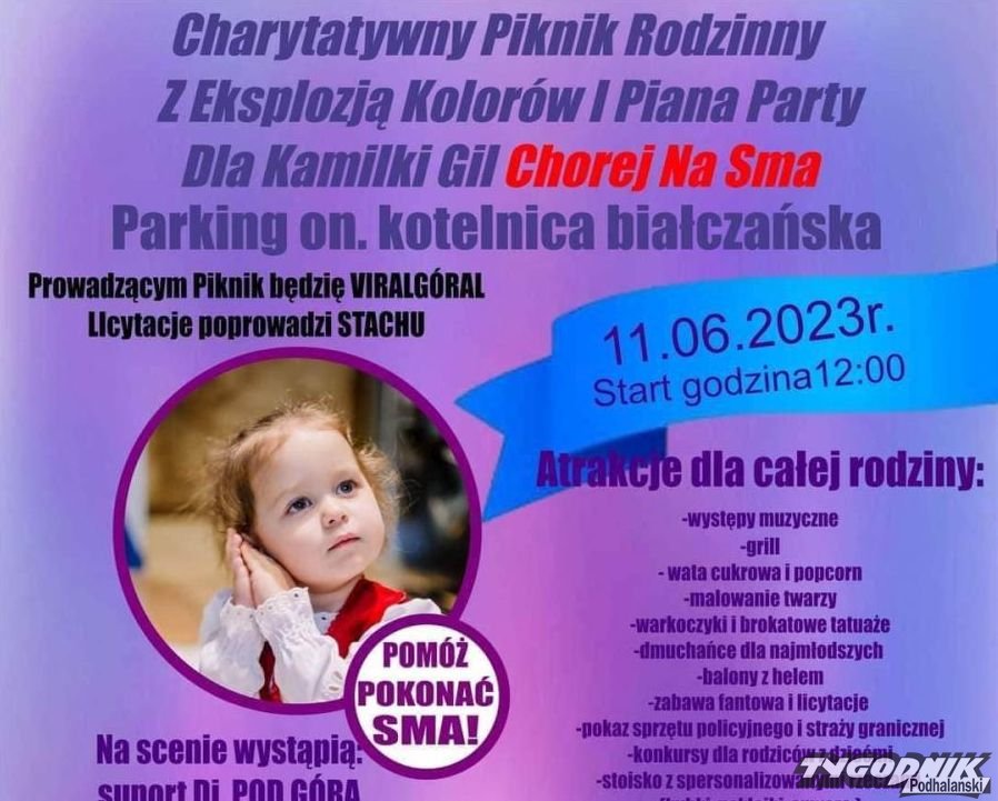 Jednym z nich jest Charytatywny Piknik Rodzinny w Białce Tatrzańskiej z eksplozją kolorów i piana party. Odbędzie się w niedzielę 11.06 na parkingu ośrodka narciarskiego Kotelnica Białczańska. Poprowadzi go Viralgóral, a licytacje Stachu. Na scenie wystąpią m.in. Mali Białcanie, DOX, zespół góralski Maxy z Bukowiny czy E-Maill. Będą też atrakcje dla całej rodziny, w tym pokaz sprzętu policyjnego i straży granicznej, konkursy dla rodziców z dziećmi, przejażdżki quadami i wiele innych.