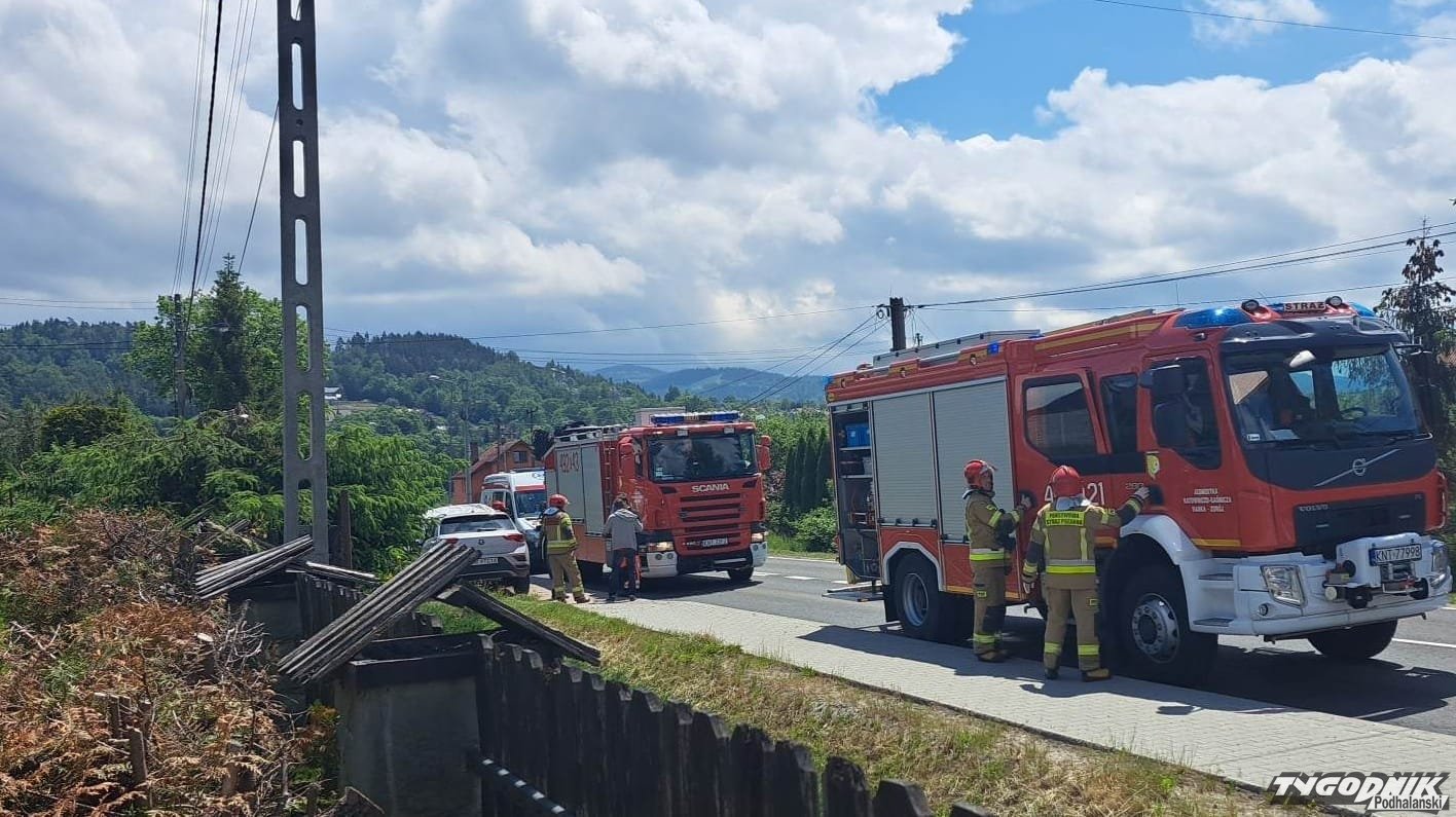 Auto wypadło z drogi i dachowało na drodze krajowej 28. Na miejscu pracowali strażacy policja i załoga karetki, która opatrzyła poszkodowanych.