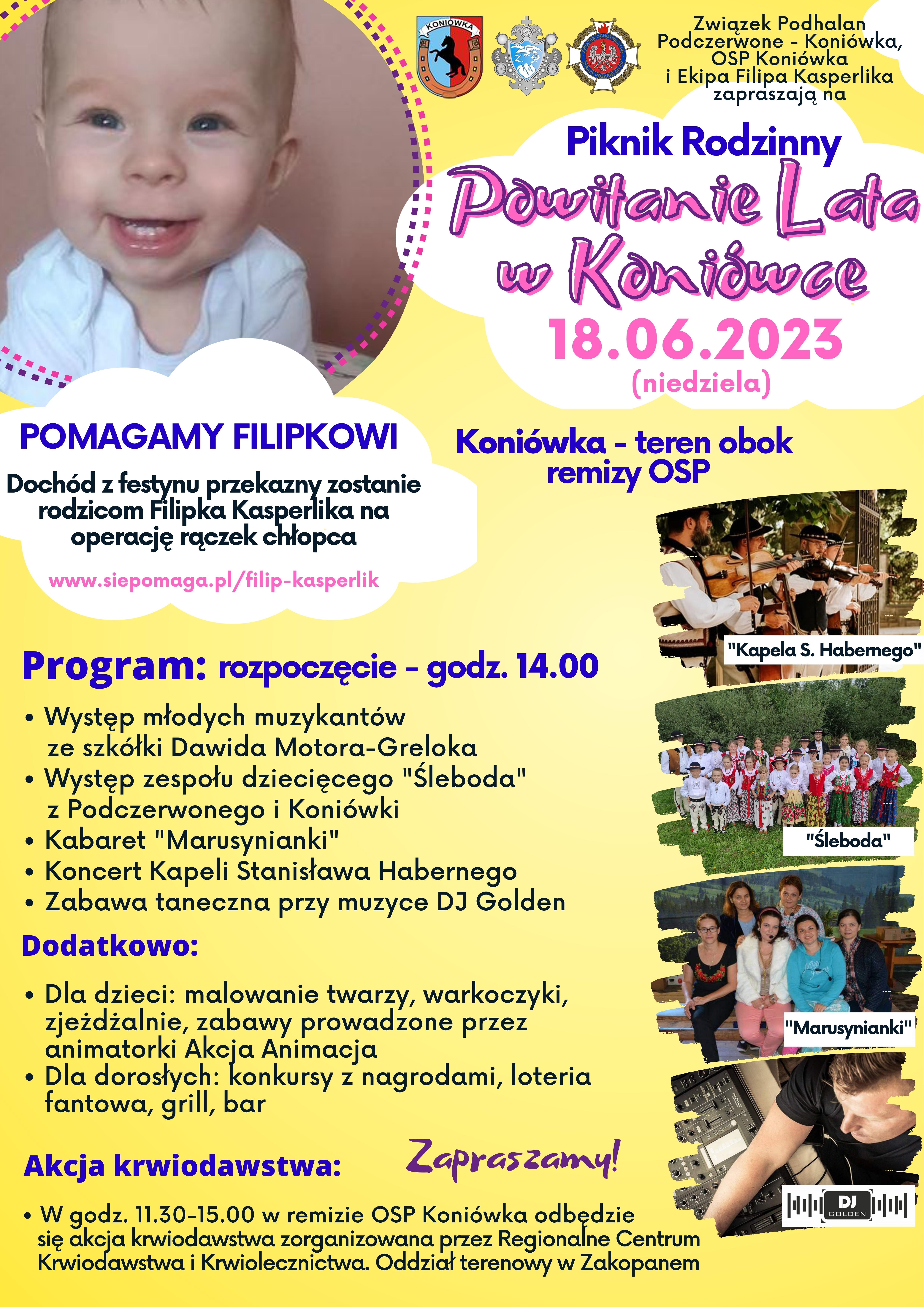 Zapraszamy zatem do Koniówki w niedzielę 18.06. Zabawa zacznie się o godzinie 14. Wszystkie jej atrakcje znajdziecie na plakacie niżej. W trakcie odbędzie się również akcja krwiodawstwa zorganizowana przez Regionalne Centrum Krwiodawstwa i Krwiolecznictwa oddział terenowy Zakopane.