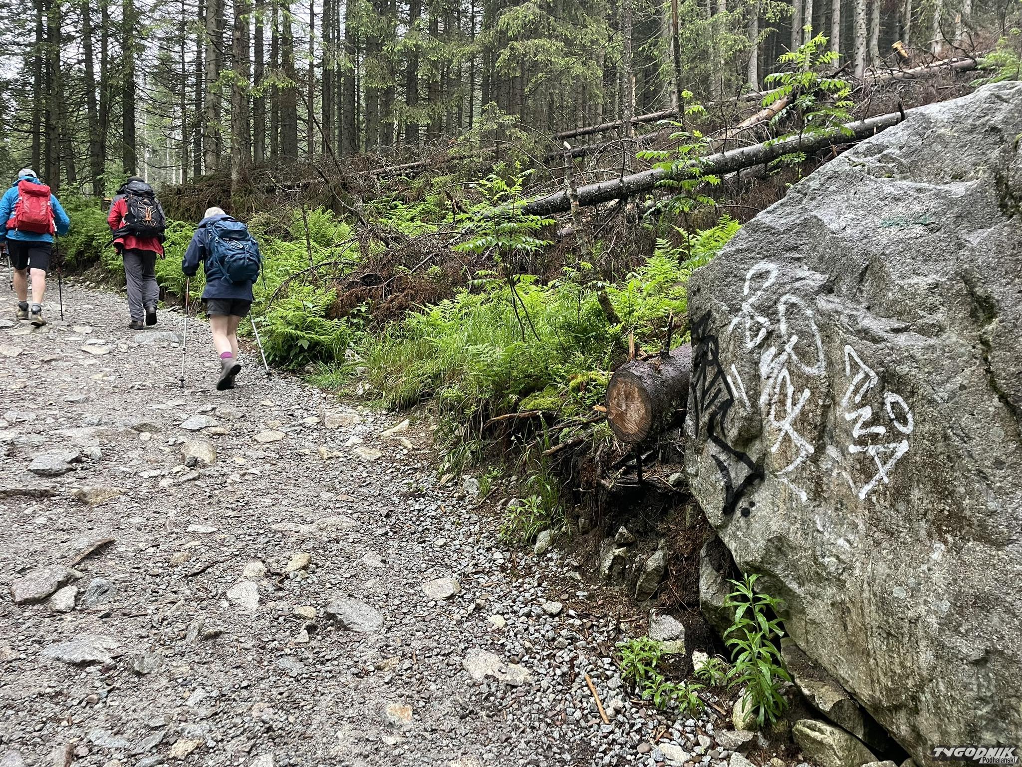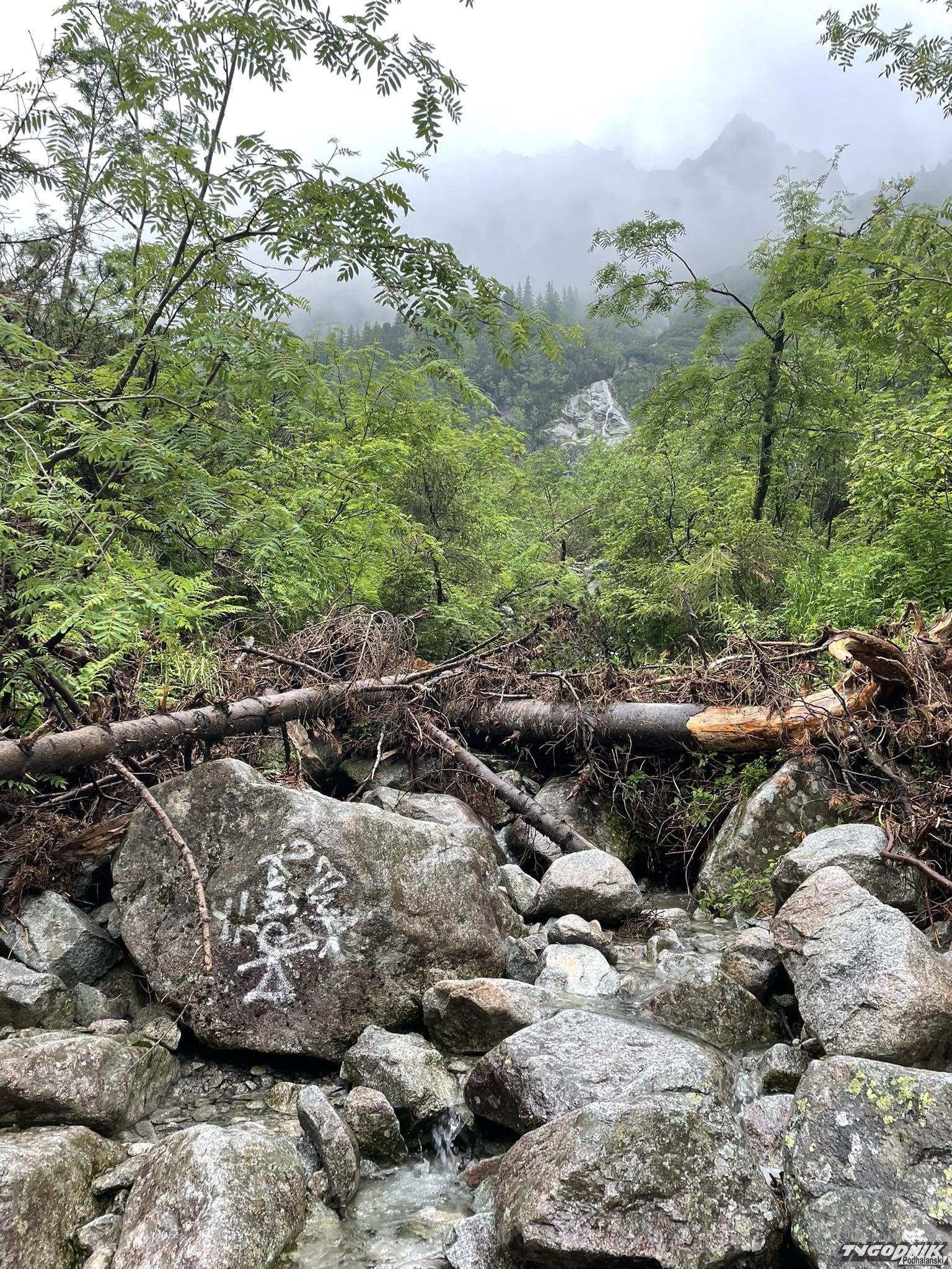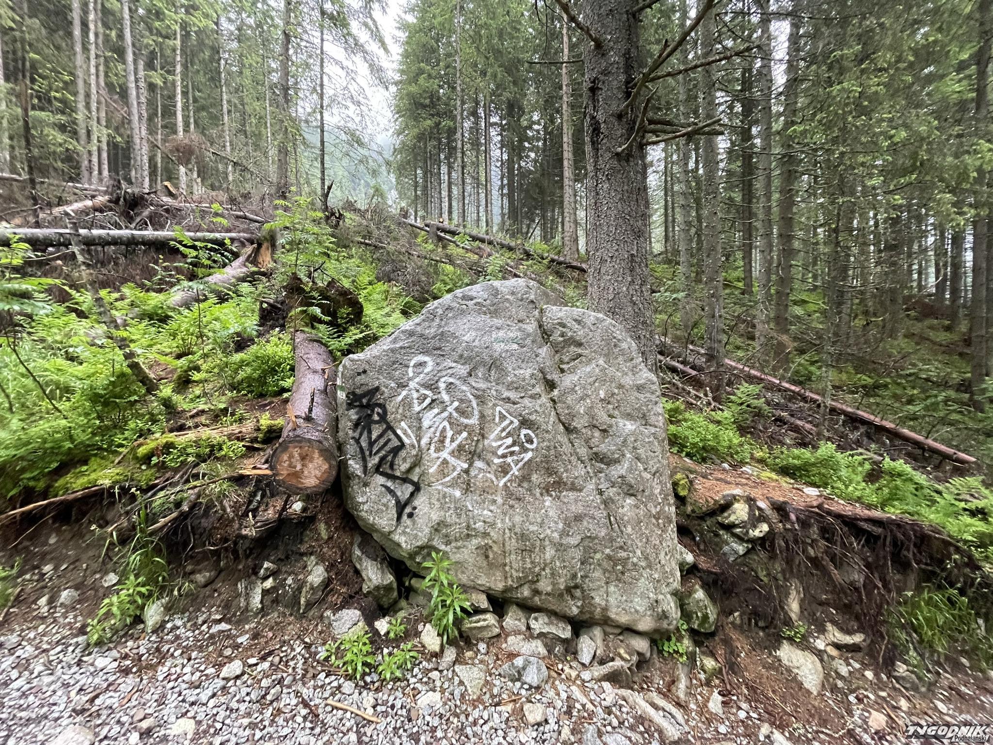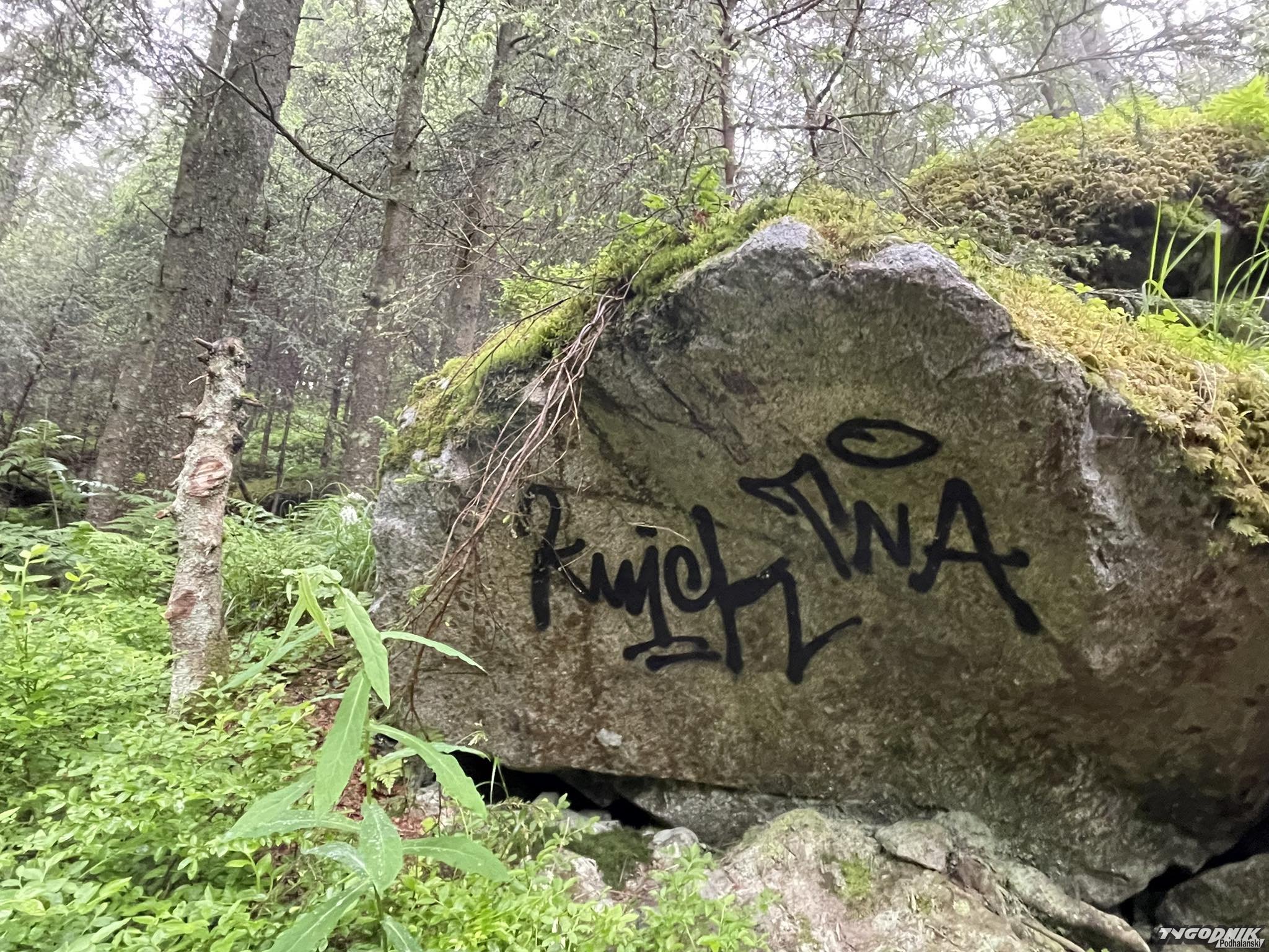 Dolina Roztoki w Tatrach zdewastowana. Ktoś na skałach namalował takie bazgroły.