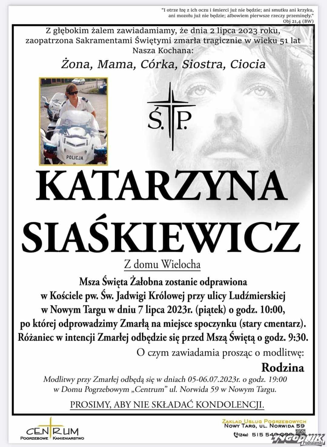 7 lipca o godz. 10 rozpoczną się w Nowym Targu uroczystości pogrzebowe byłej policjantki, która w niedzielę zginęła w tragicznym wypadku w Lubomierzu w powiecie limanowskim.