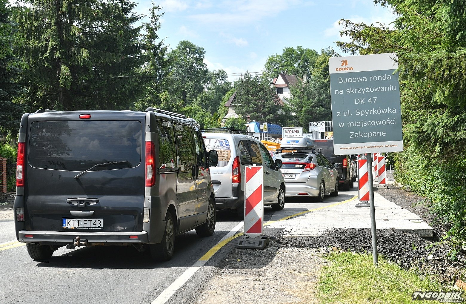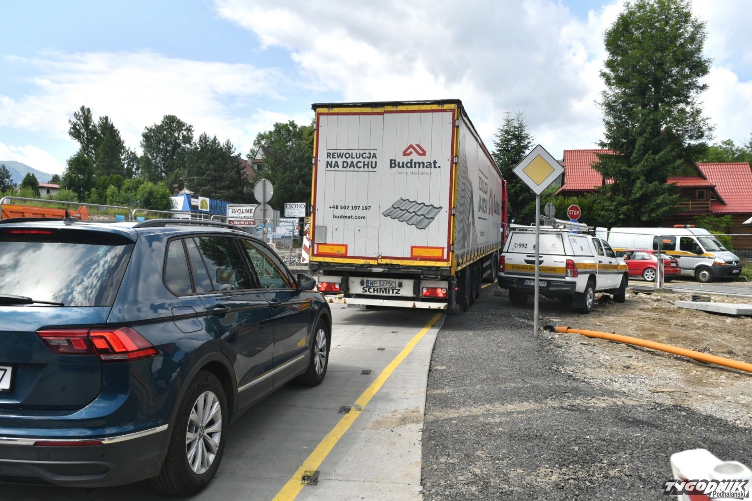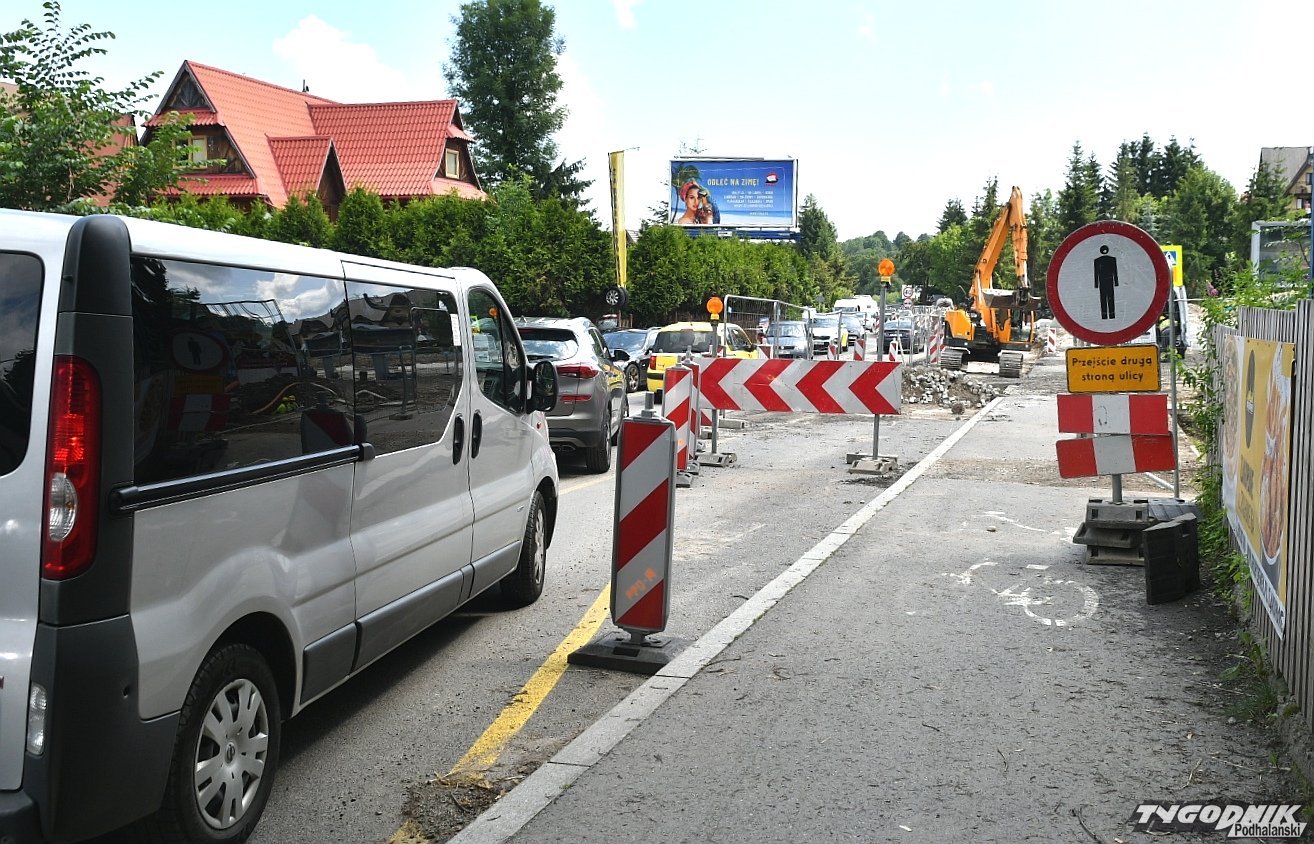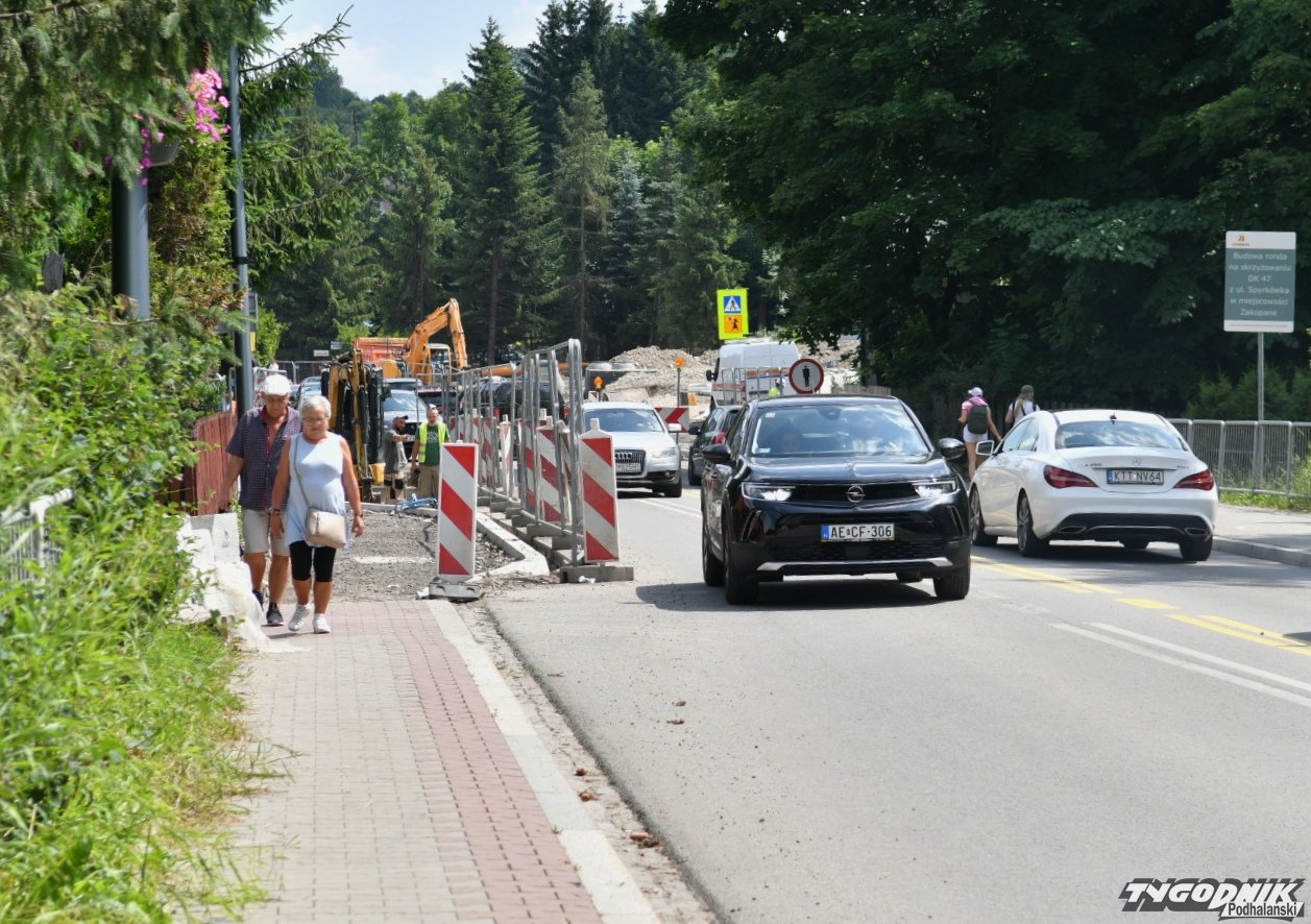 Chaos na budowie ronda przy wyjeździe z Zakopanego. Piesi przeciskają się między płotem a autami (WIDEO)