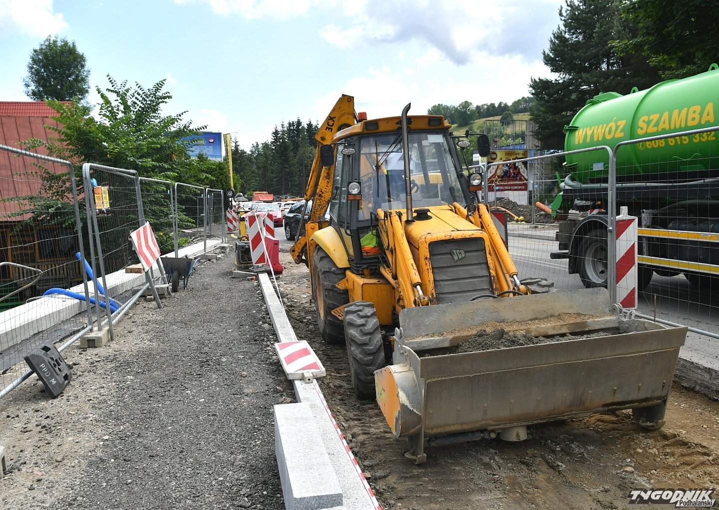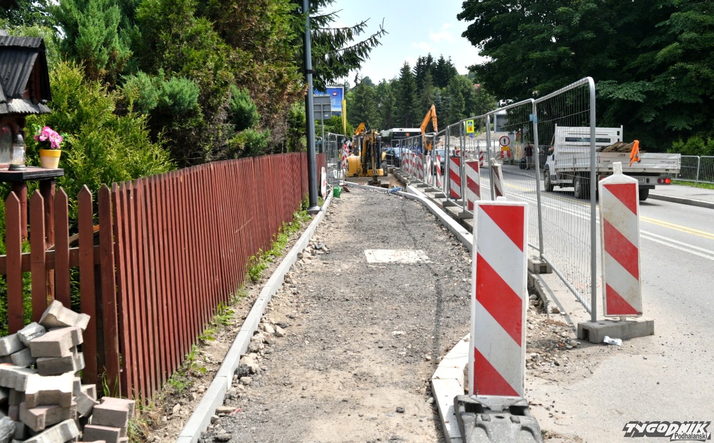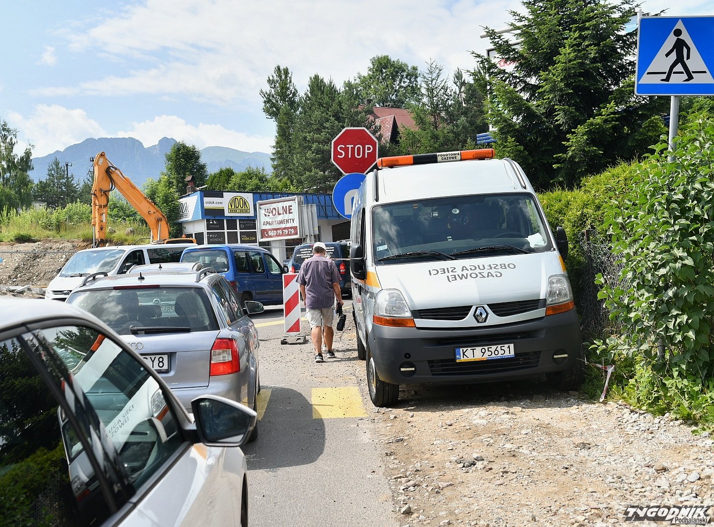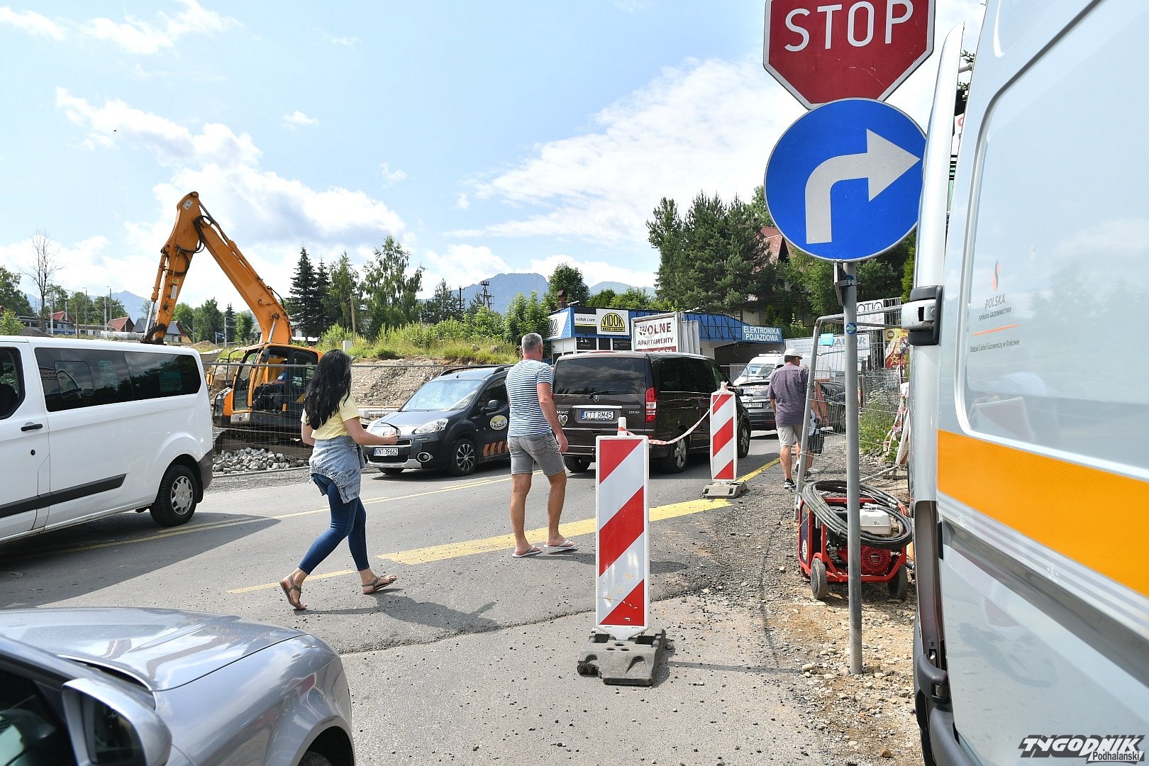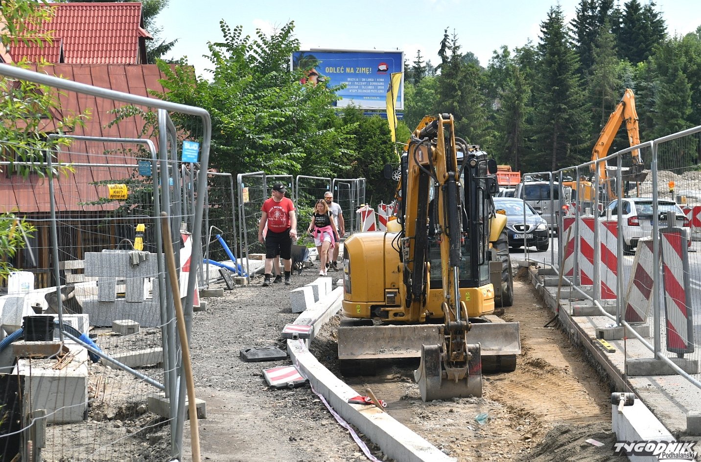 Chaos na budowie ronda przy wyjeździe z Zakopanego. Piesi przeciskają się między płotem a autami (WIDEO)
