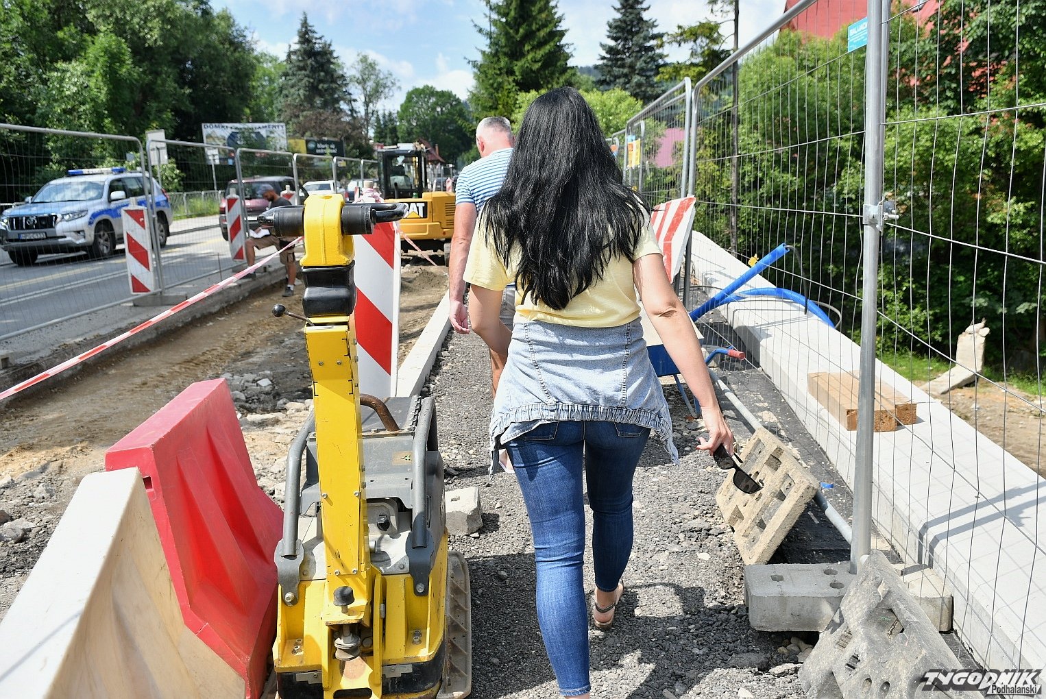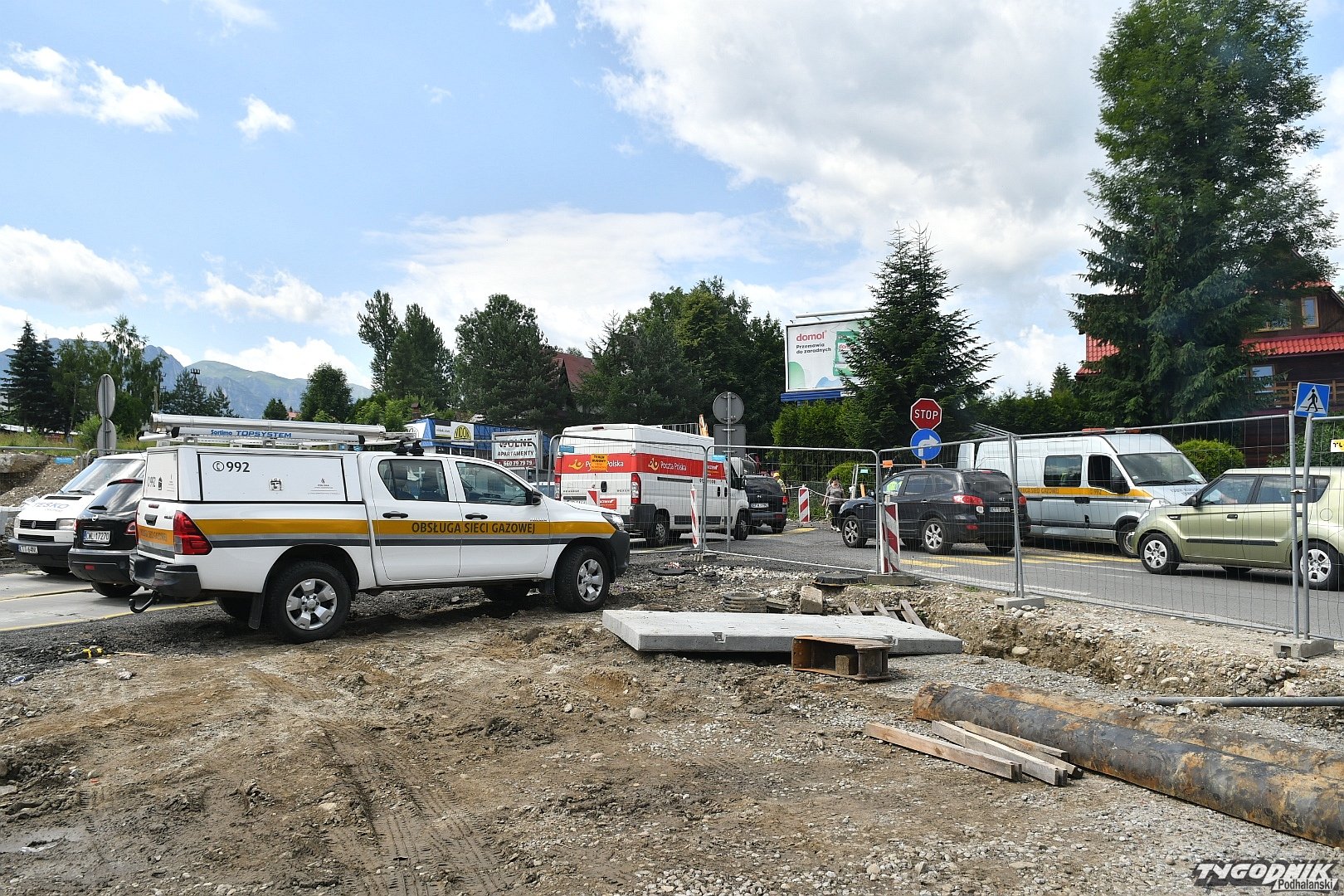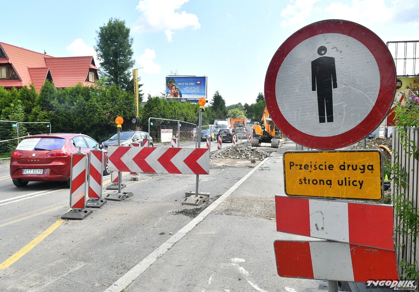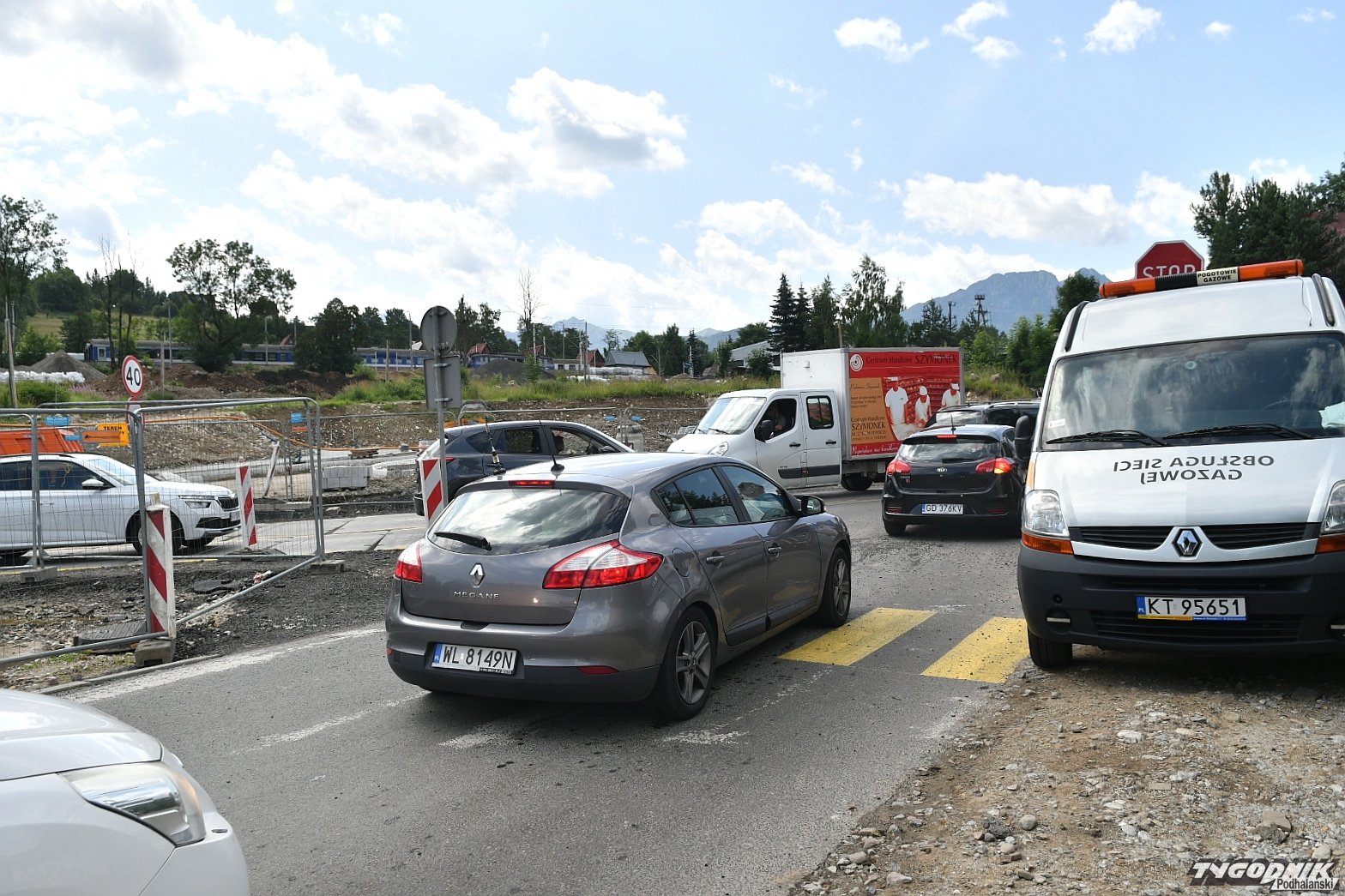 Chaos na budowie ronda przy wyjeździe z Zakopanego. Piesi przeciskają się między płotem a autami (WIDEO)