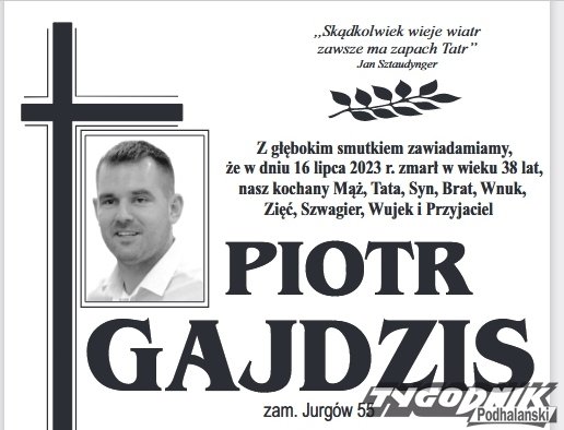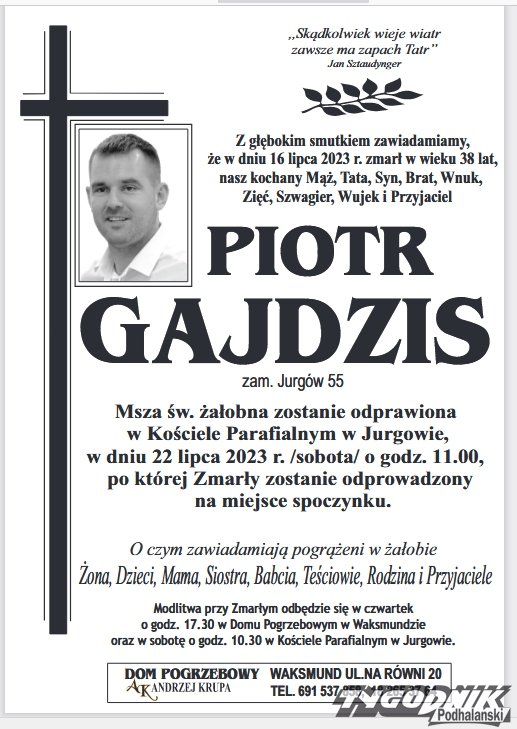 Uroczystości pogrzebowe rozpoczną się w sobotę 22 lipca o godz. 11 mszą świętą w Kościele Parafialnym w Jurgowie.