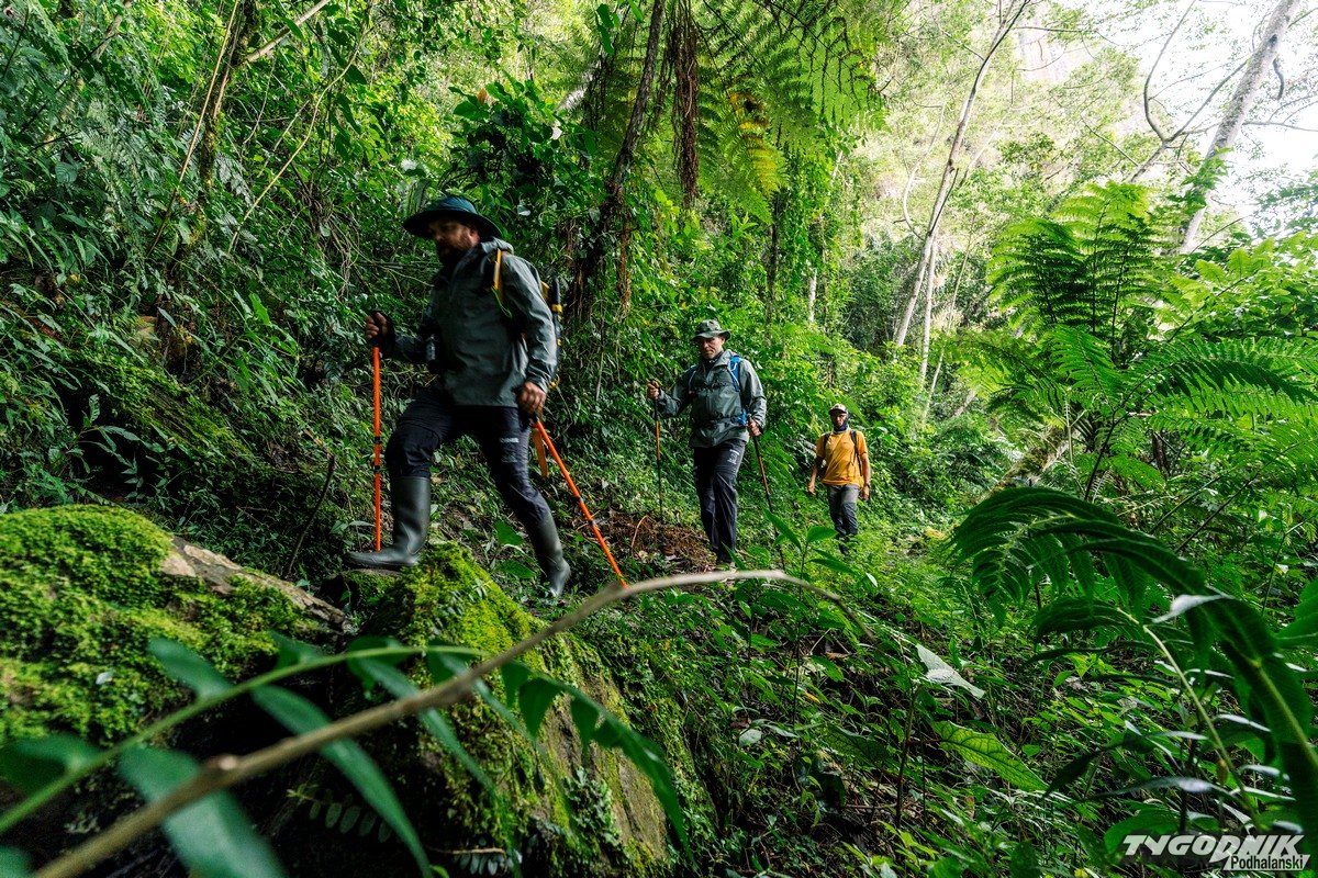 Pierwsze dni w wiosce upłynęły śmiałkom na rekonesansie. Niestety, padał deszcz. Dotarcie do początku zjazdu z wodospadu zajęło im kilka godzin. Trzeba było z maczetami przedzierać się przez dżunglę. Lokalni przewodnicy na skutek małego nieporozumienia zaprowadzili polską ekipę nie na szczyt wodospadu, który zaczynał się w jaskini, a nieco niżej. - Nie dogadaliśmy się z "lokalsami", którzy opowiadali nam o niesamowitej jaskini, ale nie wytłumaczyli, że to właśnie w niej zaczyna się wodospad. Z tego powodu zaczęliśmy zjazd nieco niżej - mówi Kuba Poburka, ratownik TOPR, drugi z mieszkańców Podhala, który bierze udział w wyprawie.