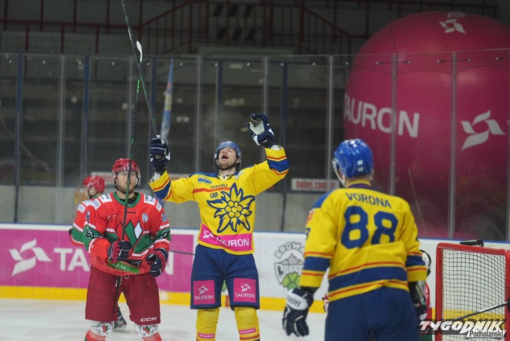 W pierwszej tercji oglądaliśmy trzy gole. Wszystkie byłem dziełem zawodników Podhala Wynik spotkania gospodarze otwarli w 4. minucie, błyskawicznie wykorzystując – za sprawą Andrieja Themara – pierwszą w meczu liczebną przewagę. W 10. minucie na 2:0 podwyższył Damian Kapica po świetnej dwójkowej akcji z Patrykiem Wronką. Z kolei w 17. minucie na 3:0 trafił – po asyście Themara – Michael Cichy. Druga tercja już zdecydowanie bardziej wyrówna. Sytuacji z obu stron było sporo, ale gol padł tylko jeden. W 23. minucie Podhalanie po raz drugi tego dnia wykorzystali grę 5 na 4 i po składnej akcji całej formacji, na listę strzelców wpisał się Łukasz Kamiński. Kilka świetnych interwencji w bramce „szarotek” zaliczył w tej odsłonie Paweł Bizub. Tercja trzecia to już wyraźna dominacja przyjezdnych. Gospodarze – mając w nogach pierwszy, intensywny tydzień przygotowań na lodzie – wyraźnie opadli z sił. Słowacy nacierali na bramkę Bizuba, ale ten pokonać się dał tylko raz. W 44. minuty krążek za jego plecy wepchnął Adam Pauliny. Zapędy słowaków nowotarżanie ostudzili w 55. minucie, po raz trzeci korzystając z liczebnej przewagi. Swojego drugiego gola w meczu zdobył Themar.