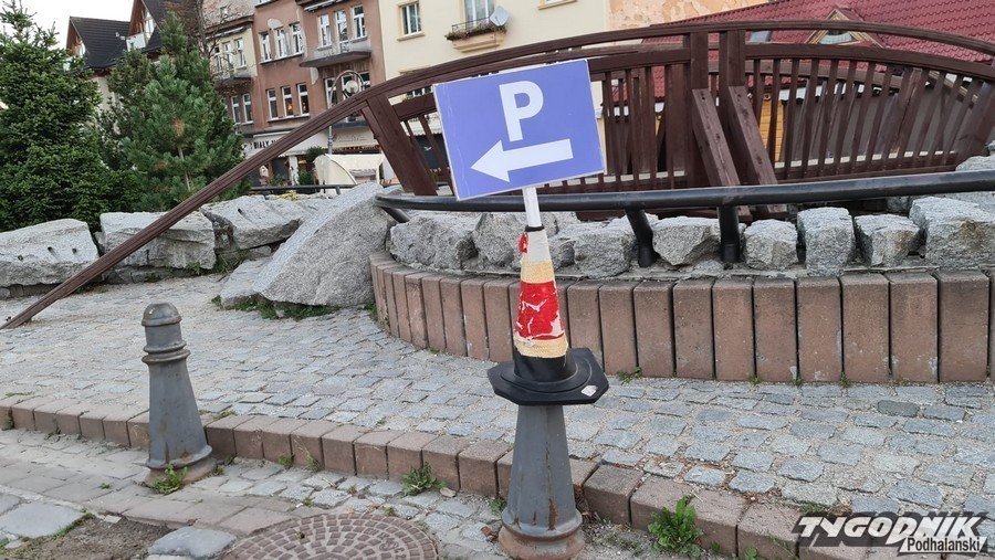 Znany zakopiański przedsiębiorca korzystając z miejskiego mienia w taki oto sposób informuje o swoim prywatnym parkingu. Pachołek drogowy został nadziany na miejski słupek, a w pachołek wbita jest tabliczka kierująca na prywatny parking. Wszystko wzmocnione taśmami przylepnymi. Patrzą na to setki, może tysiące spacerowiczów. Bo drogowskaz "biznesmen" osadził przy oczku wodnym na Krupówkach , gdzie nasi goście robią sobie pamiątkowe zdjęcia z panoramą Tatr w tle.