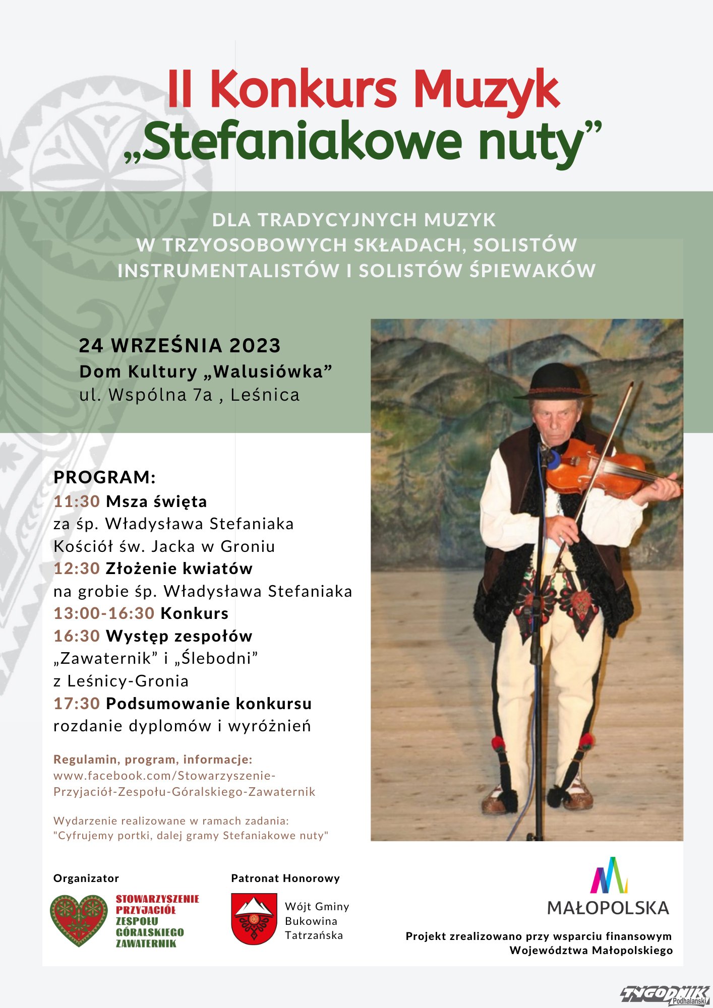 Konkurs upamiętniający prymistę z Leśnicy Władysława Stefaniaka odbędzie się w niedzielę 24 września w Domu Kultury „Walusiówka” w Leśnicy. Będzie to konkurs muzyk w tradycyjnych składach trzyosobowych (prym, sekund i basy podhalańskie), solistów instrumentalistów oraz solistów śpiewaków w kategoriach dziecięcej, młodzieżowej i dorosłych.