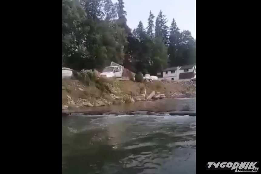 W Białym Dunajcu podjeżdża samochód załadowany żwirem z ziemią. Wszystko ląduje w rzecze.