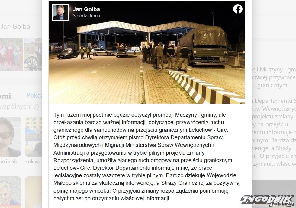 Otóż przed chwilą otrzymałem pismo Dyrektora Departamentu Spraw Międzynarodowych i Migracji Ministerstwa Spraw Wewnętrznych i Administracji o przygotowaniu w trybie pilnym projektu zmiany Rozporządzenia, umożliwiającego ruch drogowy na przejściu granicznym Leluchów- Cirć. Dyrektor Departamentu informuje mnie, że prace legislacyjne zostały wszczęte w trybie pilnym. Bardzo dziękuję Wojewodzie Małopolskiemu za skuteczną interwencję, a Straży Granicznej za pozytywną opinię mojego wniosku. O przyjęciu zmiany rozporządzenia poinformuję natychmiast po otrzymaniu właściwej informacji."