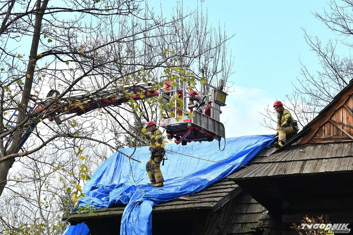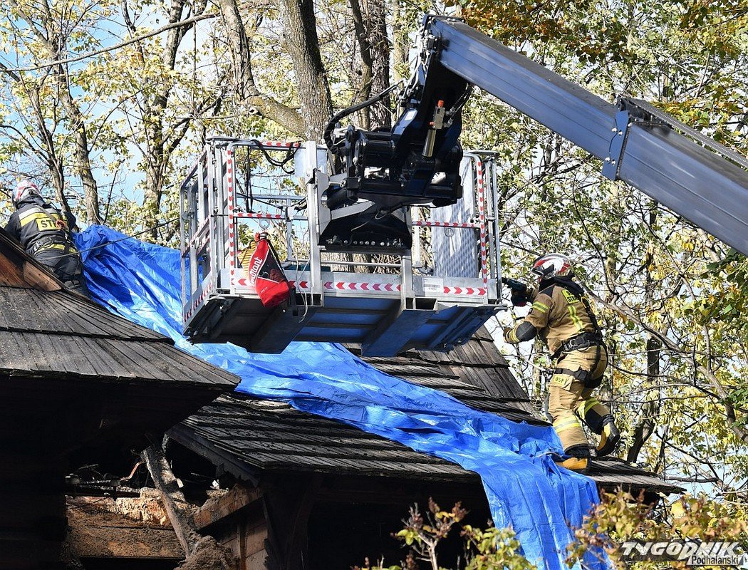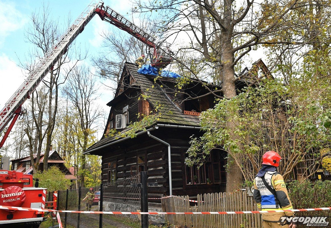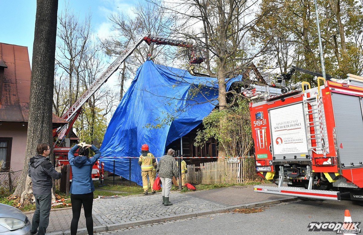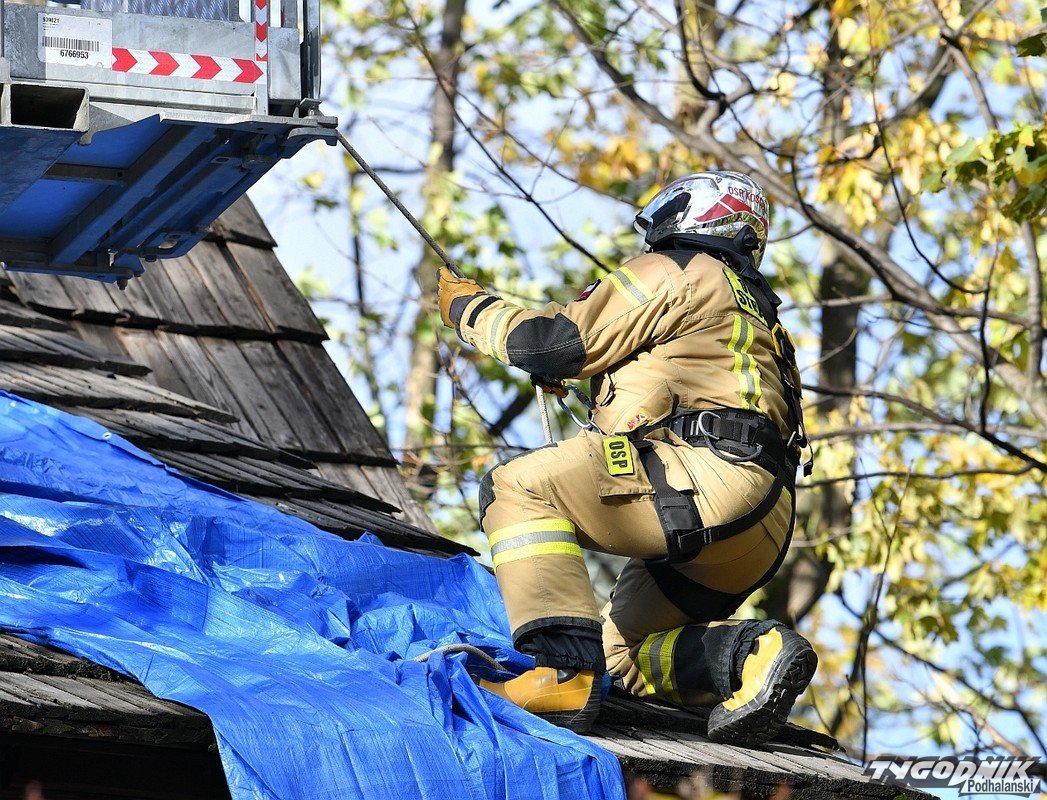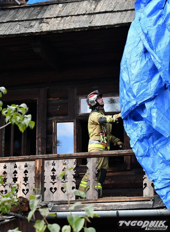 Strażacy zabezpieczają dziś dach zabytkowego Domu Doktora, którego poddasze spaliło się we wtorkowy wieczór w Zakopanem.