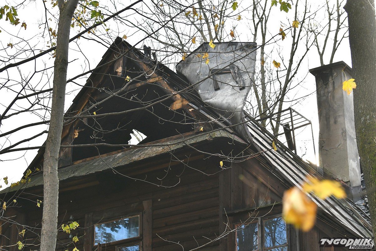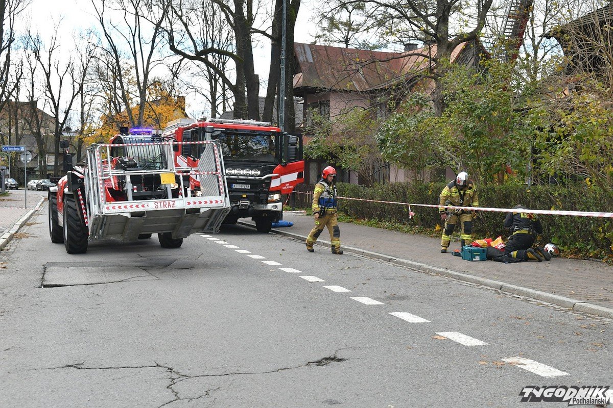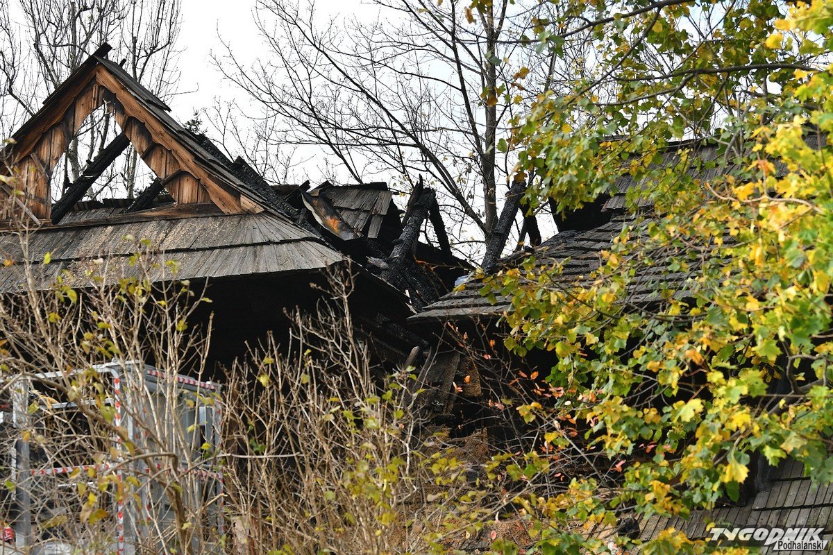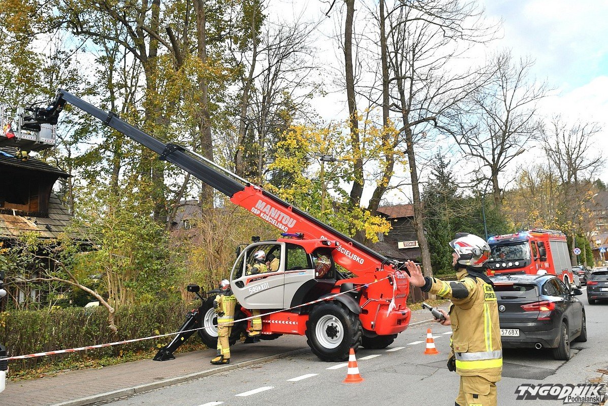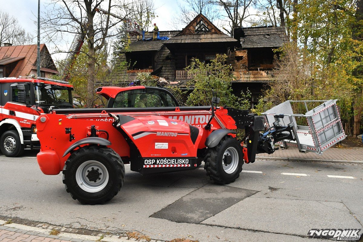 Strażacy zabezpieczają dziś dach zabytkowego Domu Doktora, którego poddasze spaliło się we wtorkowy wieczór w Zakopanem.