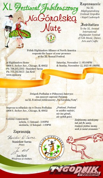 XL Festiwal Na Góralską Nutę Związku Podhalan w Północnej Ameryce odbędzie się w sobotę 11 listopada i niedzielę 12 listopada w siedzibie Związku Podhalan przy 4808 S. Archer Ave, w Chicago.