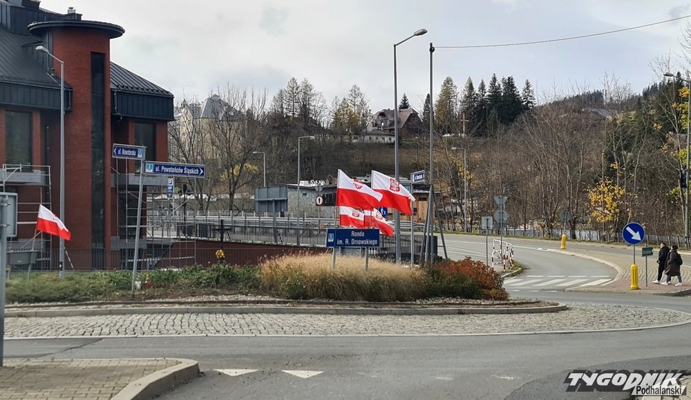 Na Rondzie Dmowskiego w Zakopanem przed świętem 11 Listopada pojawiły się biało-czerwone flagi z orzełkiem.