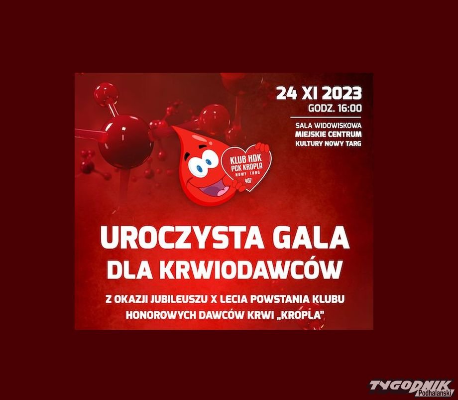 Z tej okazji w sali widowiskowej Miejskiego Centrum Kultury w Nowym Targu w piątek 24.11 odbędzie się uroczysta gala dla krwiodawców. O jej oprawę muzyczną zadba orkiestra reprezentacyjna Straży Granicznej pod batutą naczelnika orkiestry ppłk SG Leszka Mieczykowskiego z Karpackiego Oddziału Straży Granicznej w Nowym Sączu.