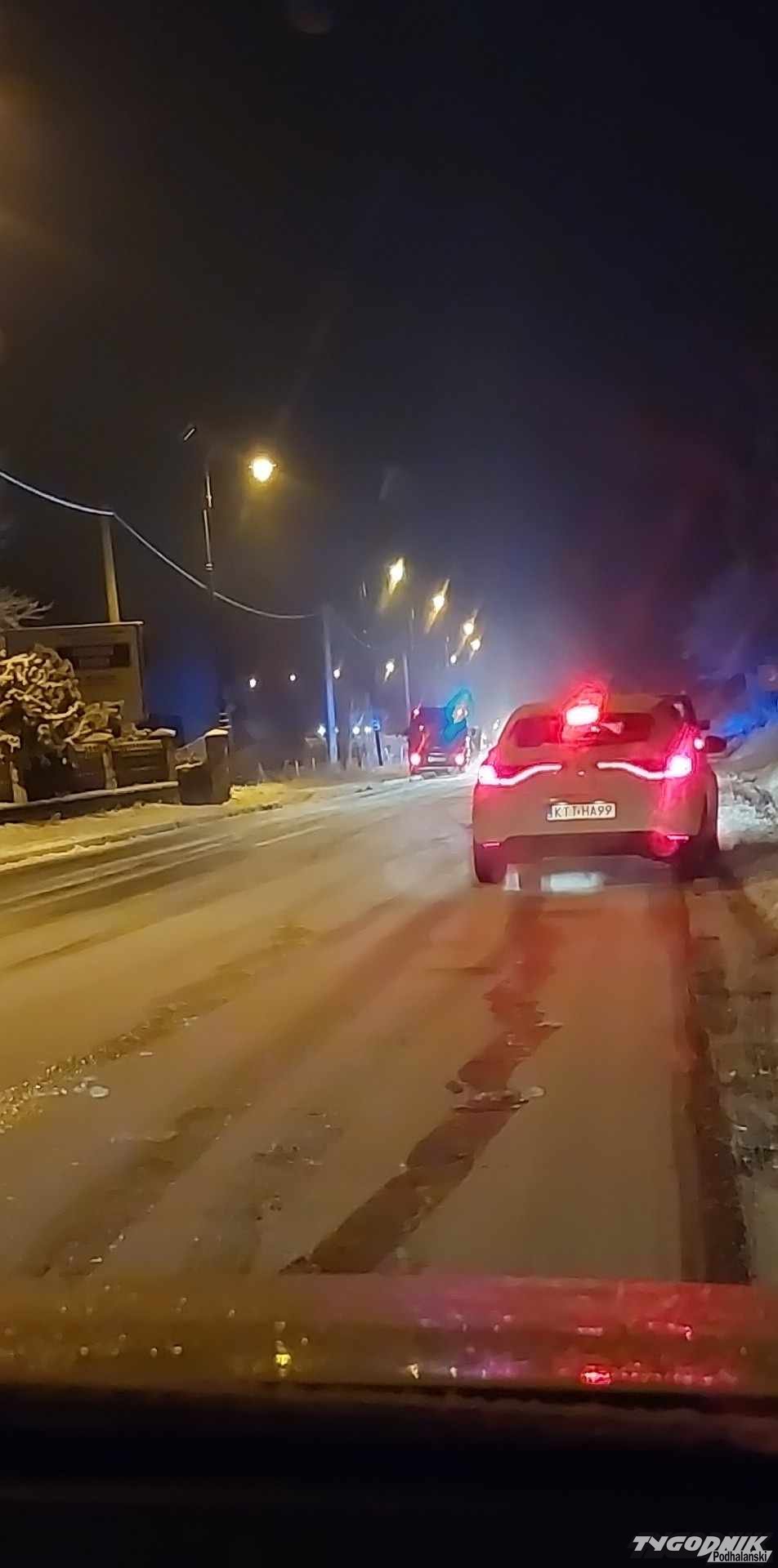 Jak informują kierowcy, zatory tworzą się od ronda w dolnej części miejscowości do kościoła. Nie dość, że droga jest śliska, to jeszcze doszło do kolizji.