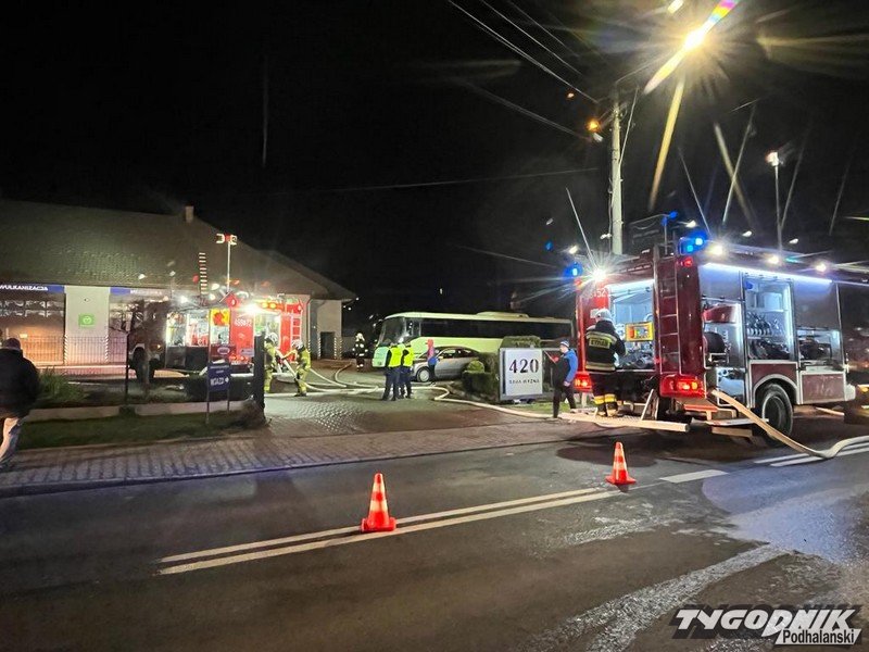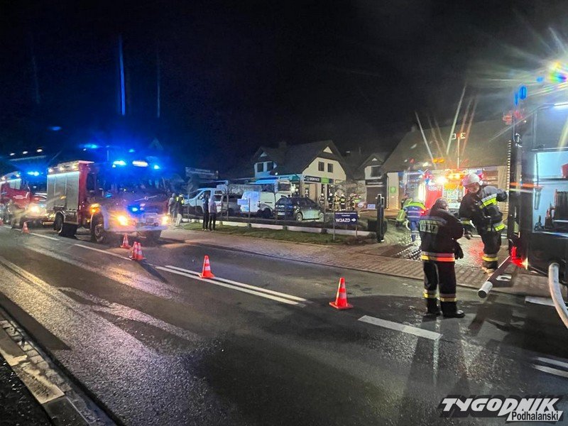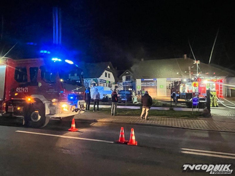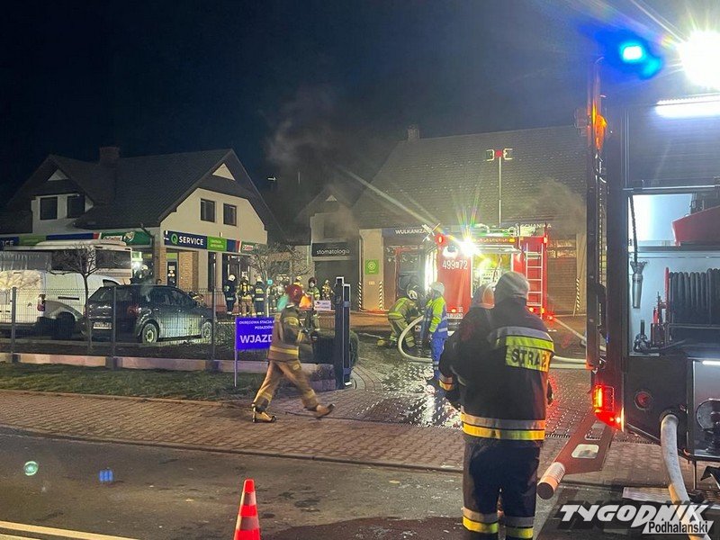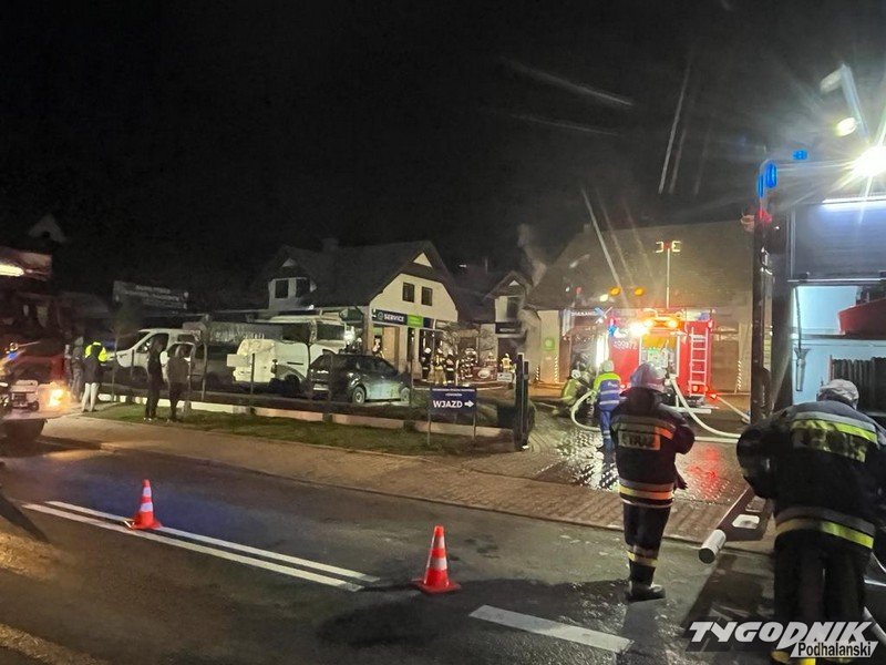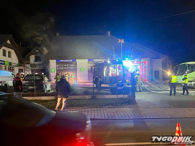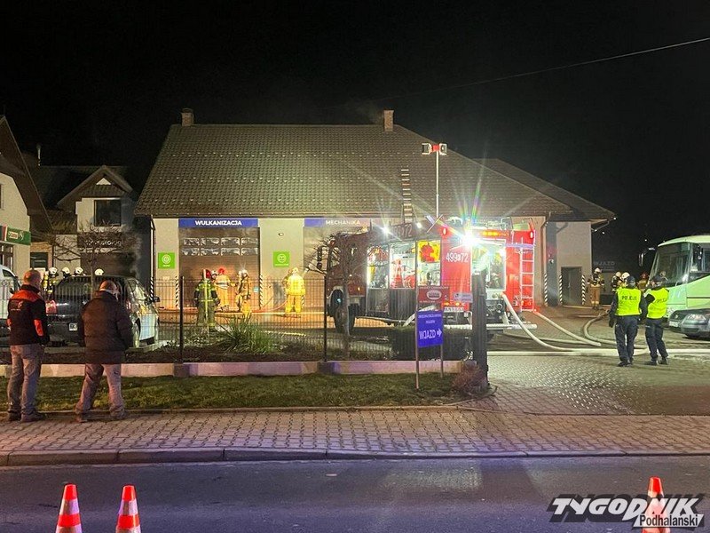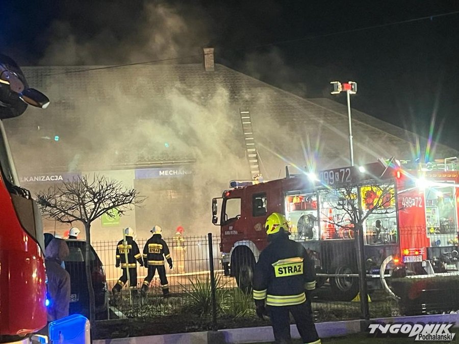 Strażacy walczą z pożarem dużego warsztatu samochodowego w Rabie Wyżnej. Ruch na drodze wojewódzkiej jest utrudniony. Trwa akcja ratowniczo-gaśnicza. Na miejscu pracują strażacy z użyciem aparatów tlenowych.