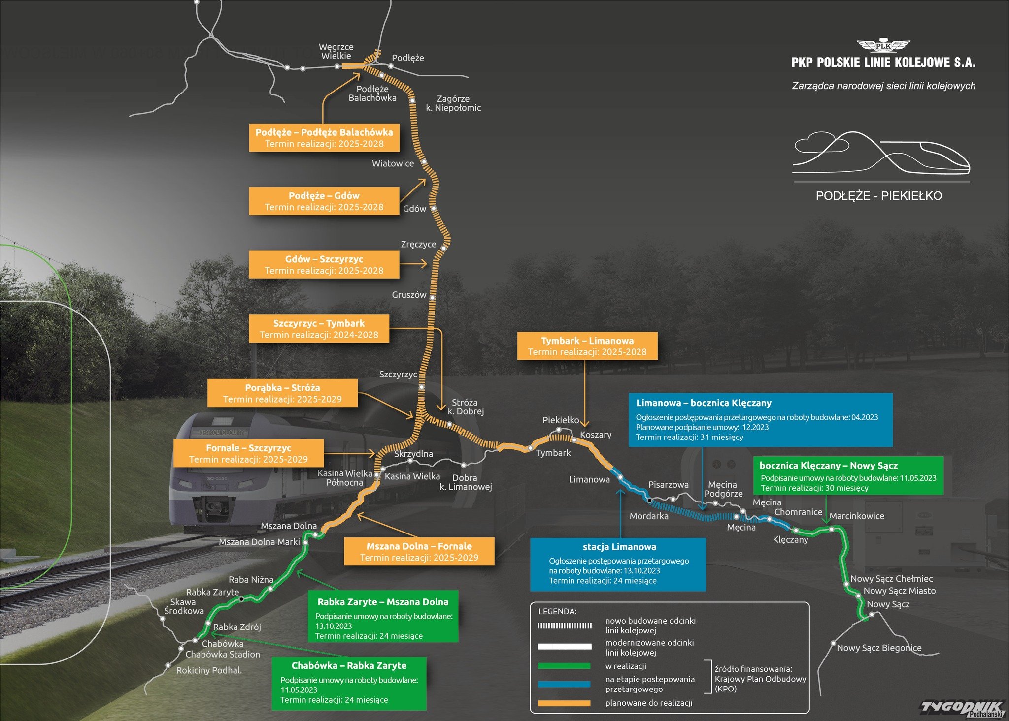 O ile prace na odcinkach Chabówka - Mszana Dolna i Nowy Sącz - Klęczany już trwają to pozostałe odcinki są albo na etapie przygotowania do przetargu, albo w fazie planowania do realizacji. Na załączonej mapce przygotowanej przez PKP PLK widać zakładane terminy oddania do realizacji poszczególnych etapów. Jaki jest najbardziej optymistyczny wniosek po przestudiowaniu zapisów na wizualizacji? Nową trasą z Chabówki czy Nowego Sącza do Krakowa - Podłęża mamy przejechać w 2029 roku czyli już za sześć lat. Realne? Odpowiedzcie sami!