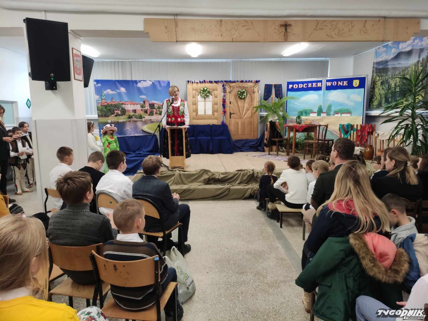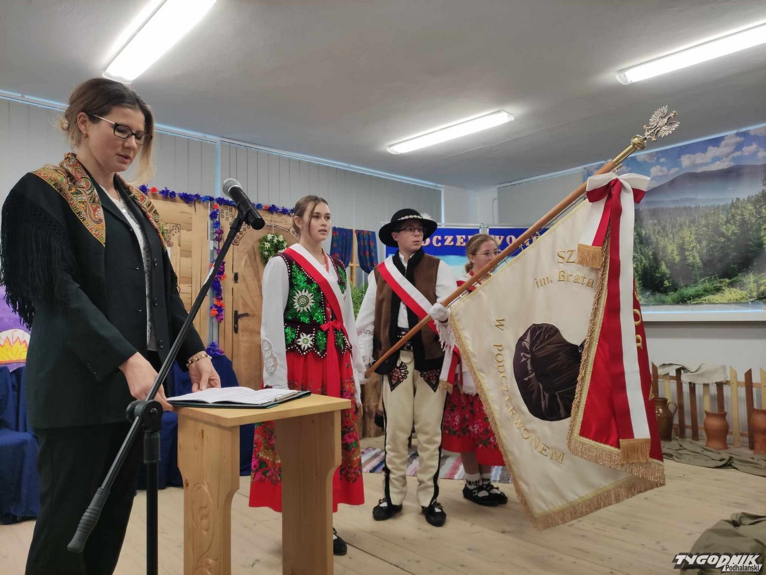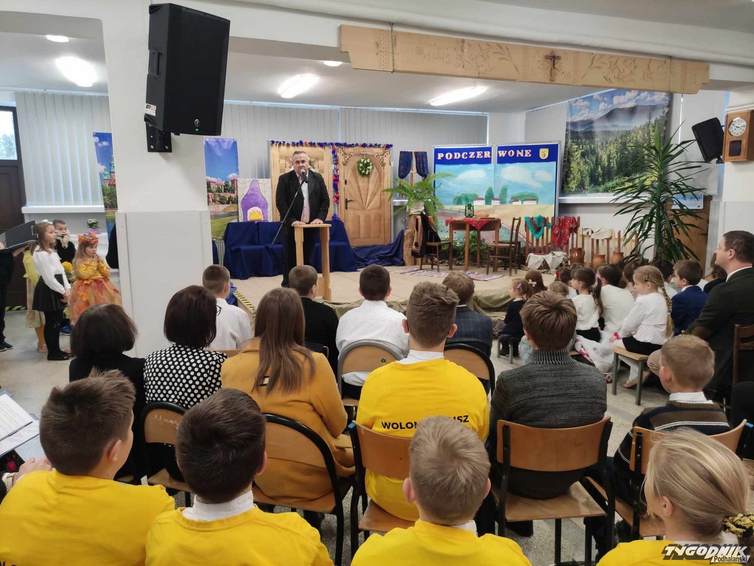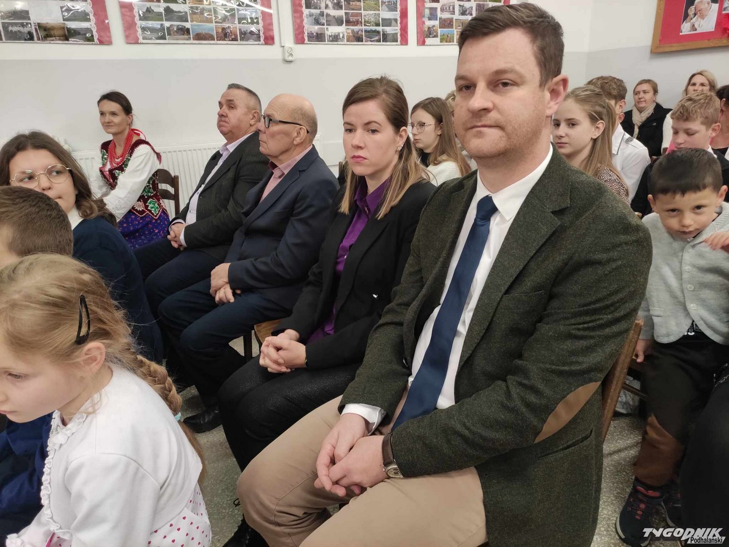 Następnie wszyscy udali się do szkoły, gdzie odbyła się dalsza część uroczystości. Wzięli w niej udział uczniowie, nauczyciele oraz rodzice, babcie i dziadkowie. Wielu z nich ukończyło też przed laty tę szkołę.