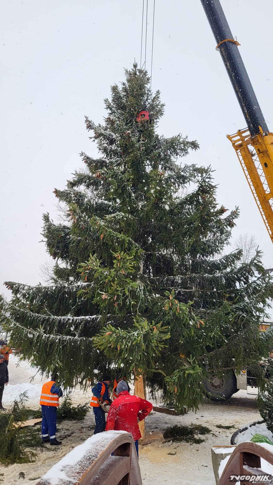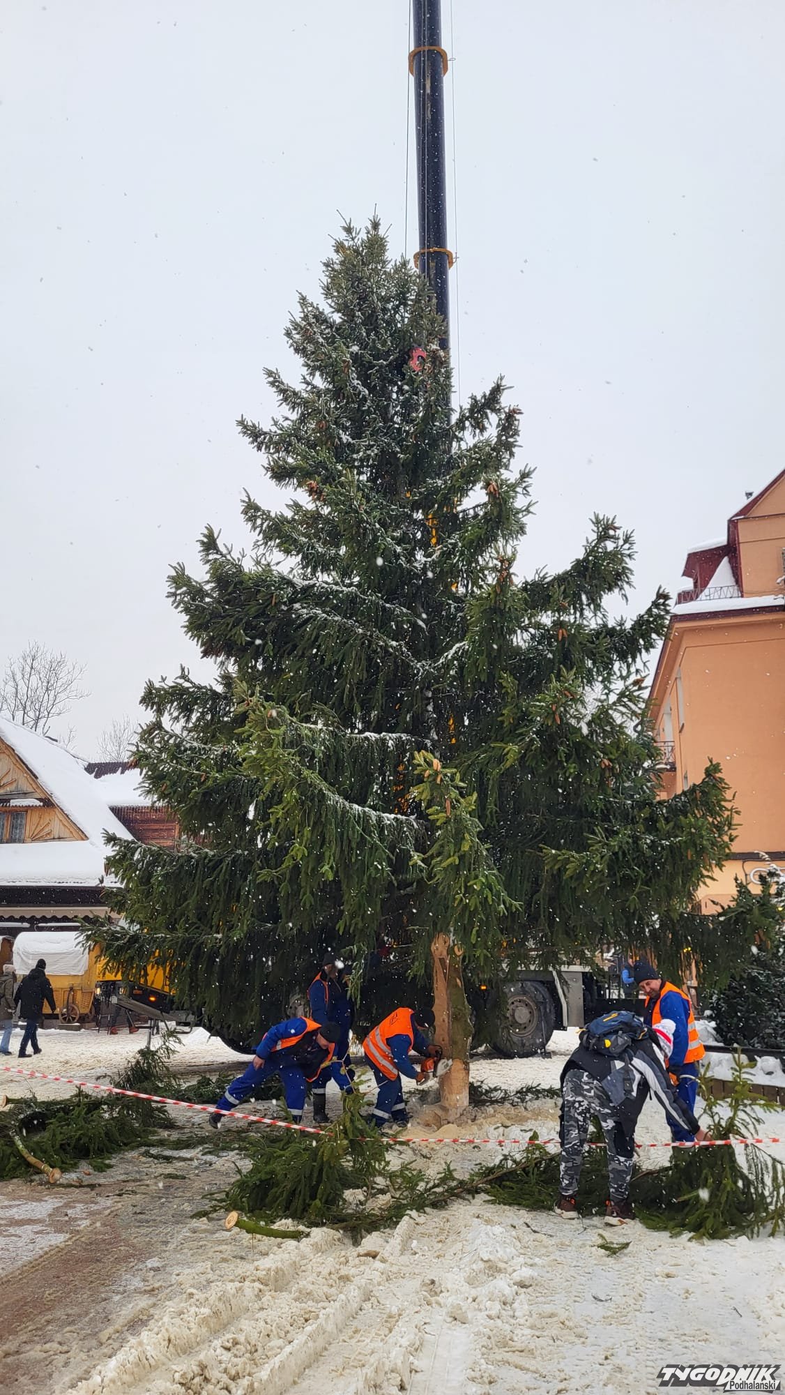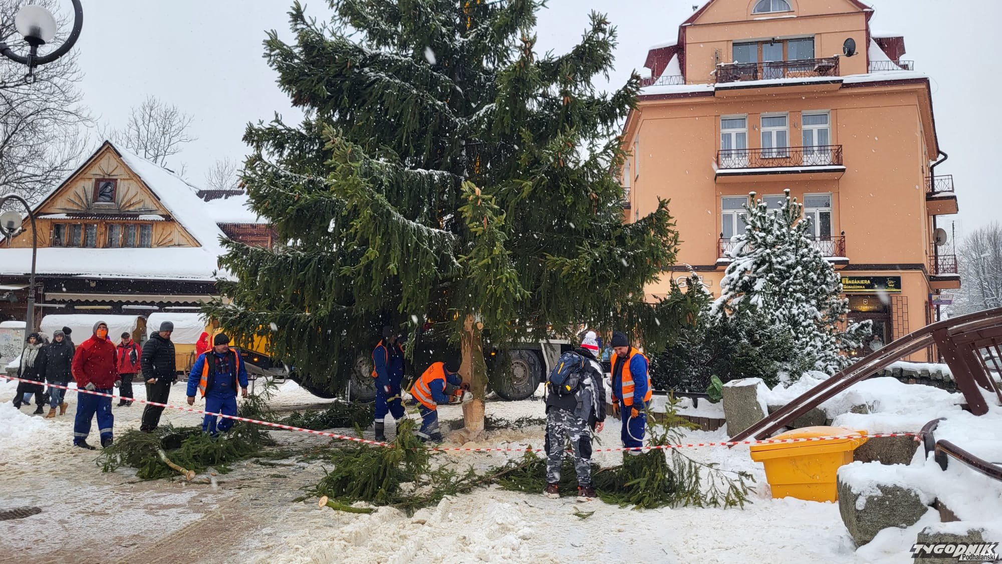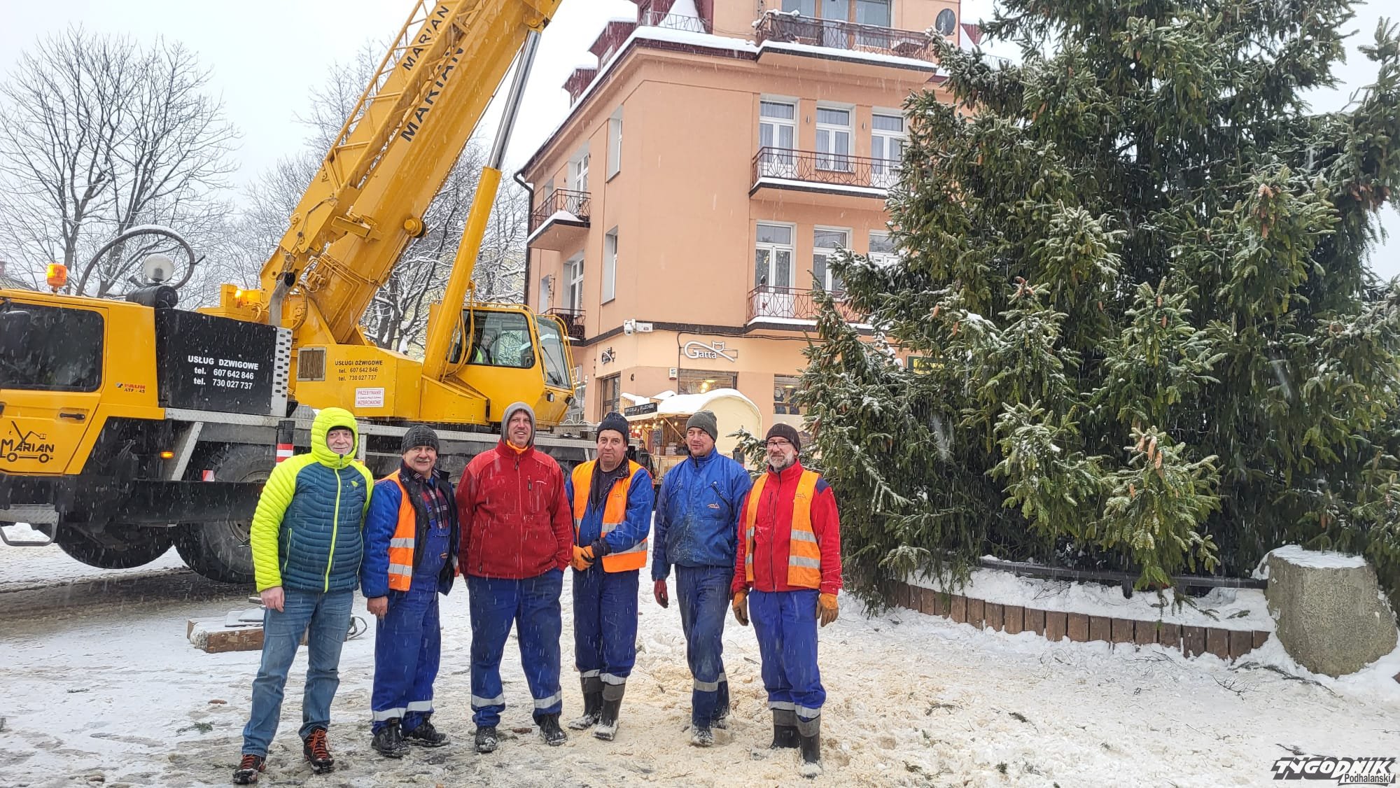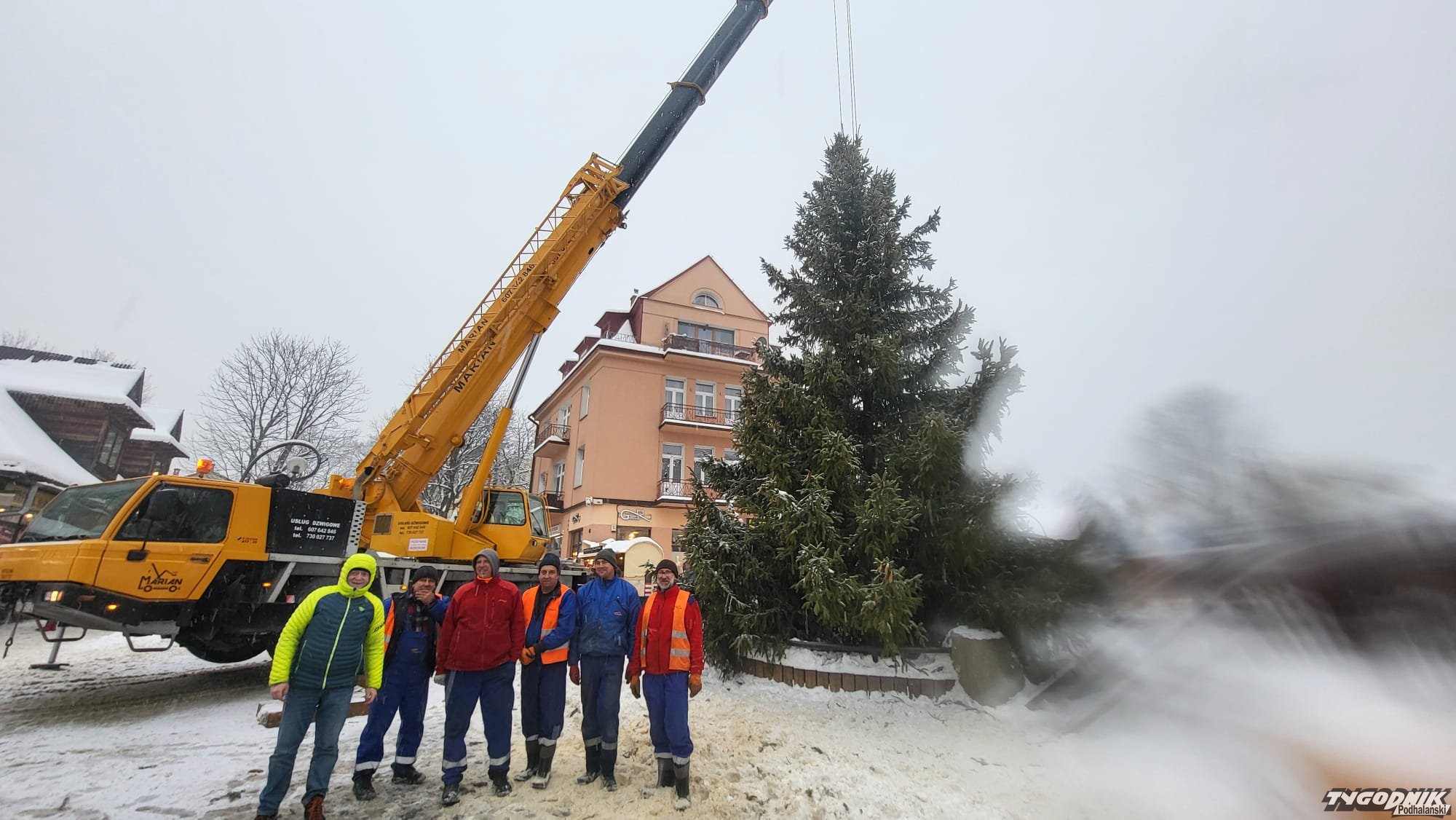 Przy Oczku Wodnym w Zakopanem miejskie służby stawiają choinkę.