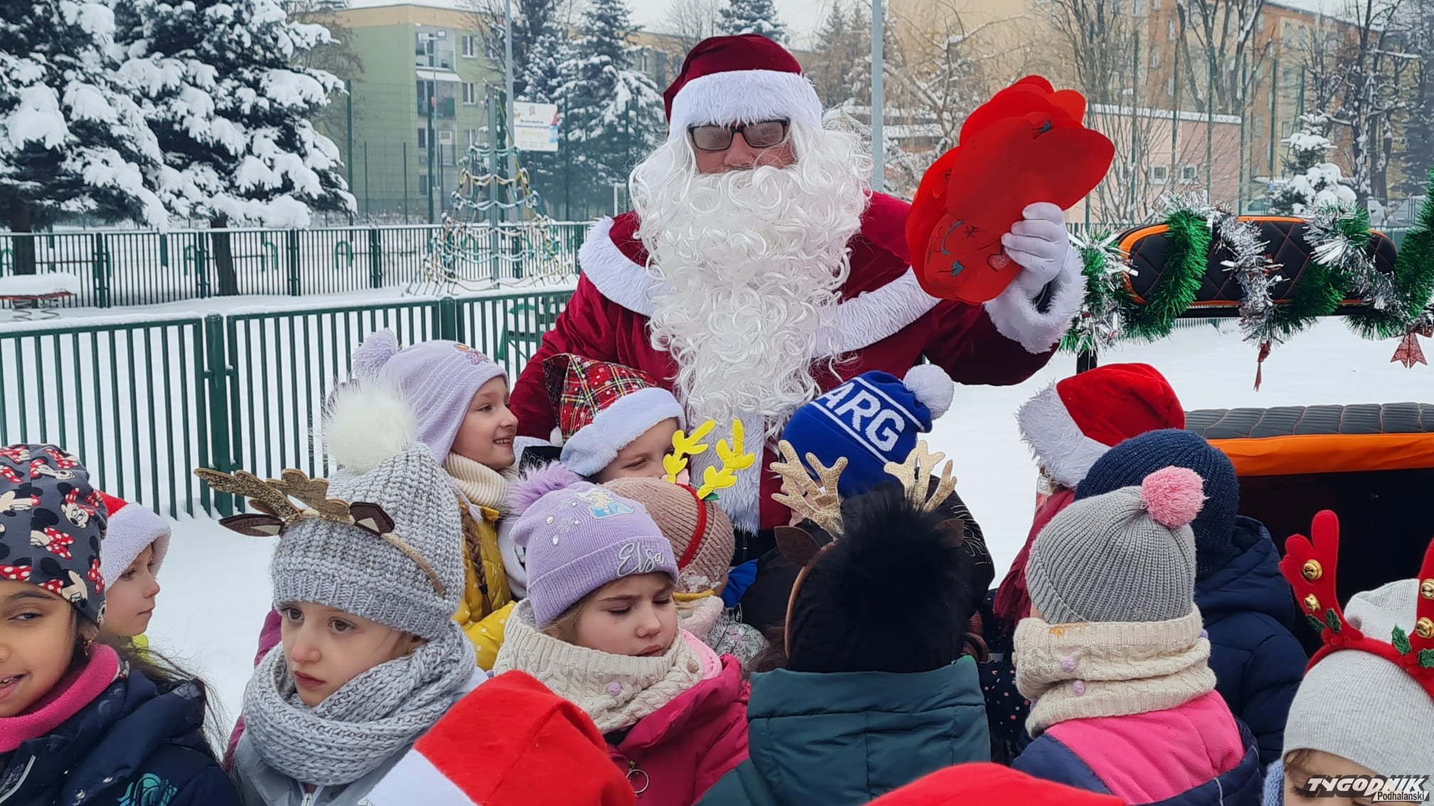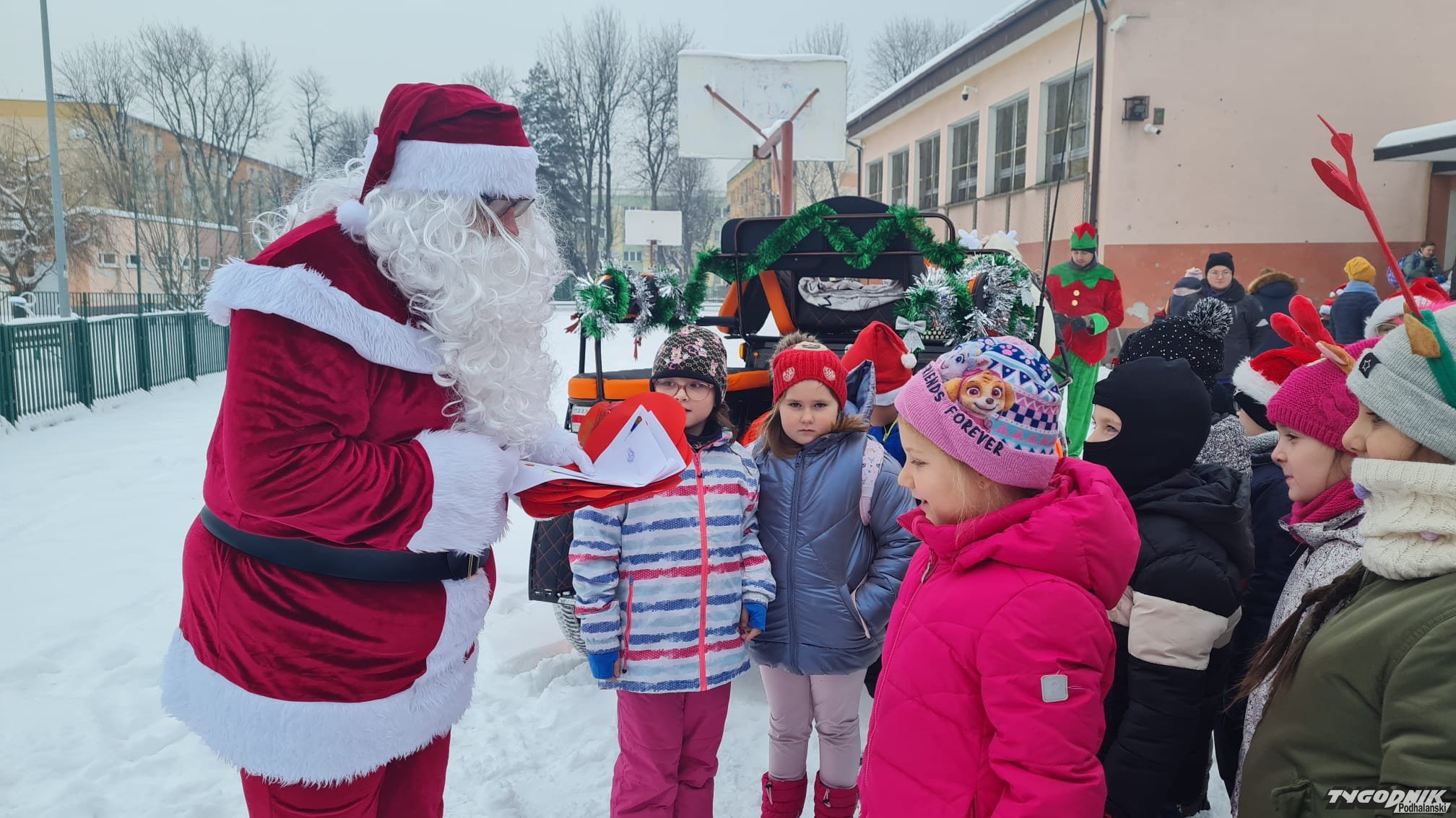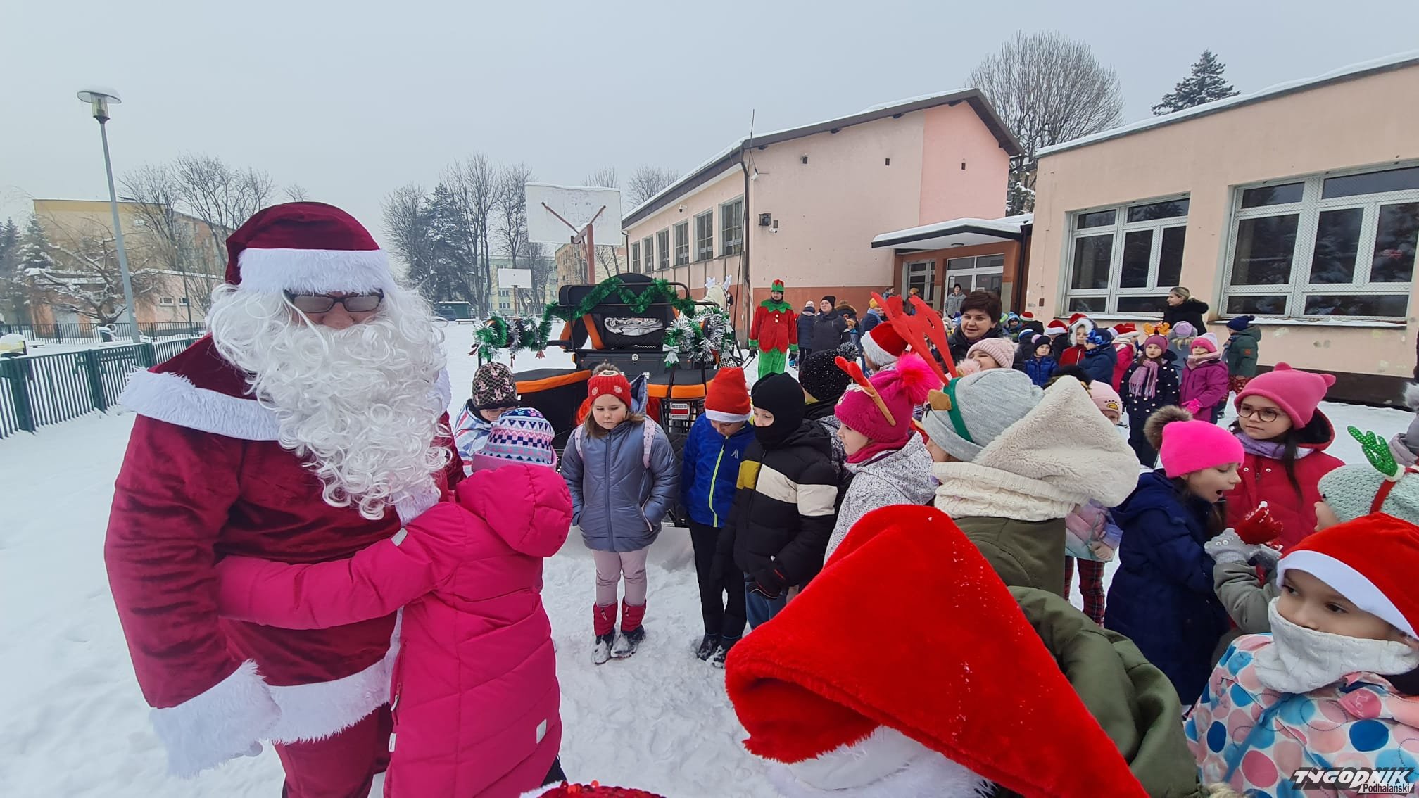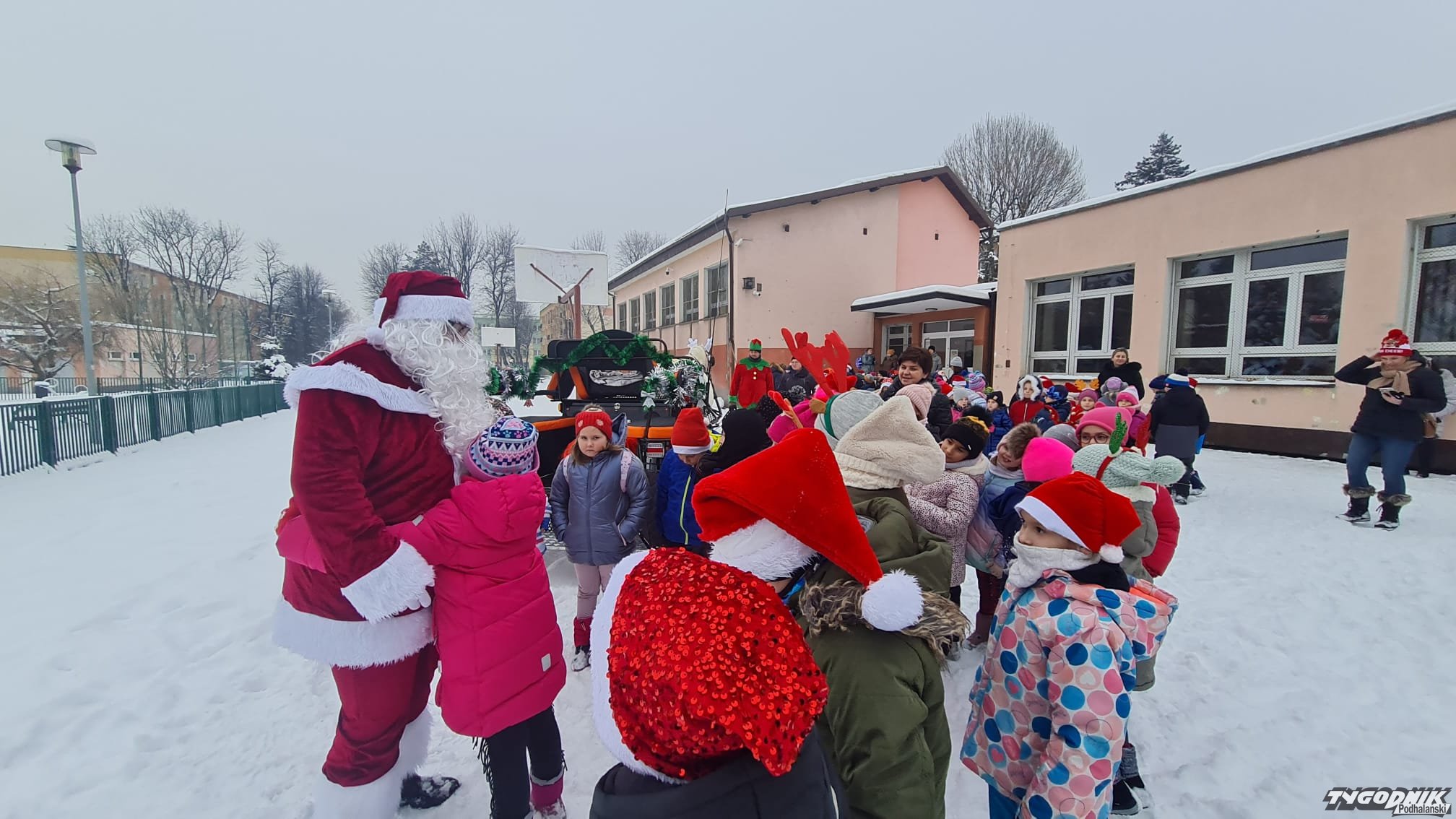 Ponieważ najgrzeczniejsze dzieci są w Szkole Podstawowej nr 2 w Nowym Targu, objazd po stolicy Podhala rozpoczął od odwiedzenia uczniów z tej właśnie podstawówki. Były przytulańce, wspólne selfie, no i .....prezenty.