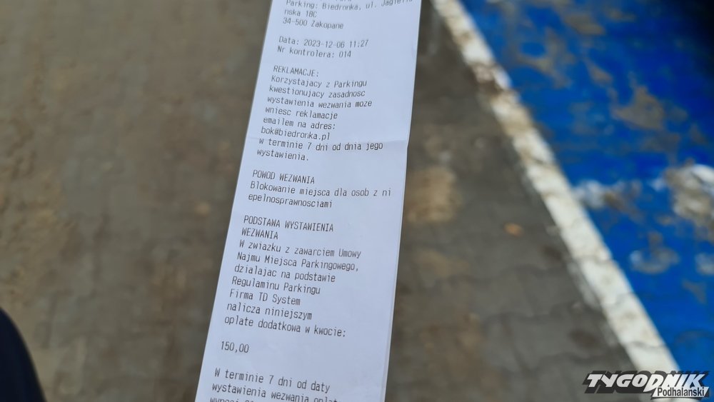 150 złotych kary ma zapłacić kierowca, który zaparkował na zaśnieżonym - jak twierdzi - i źle oznakowanym miejscu dla niepełnosprawnych przed Biedronką w Zakopanem.