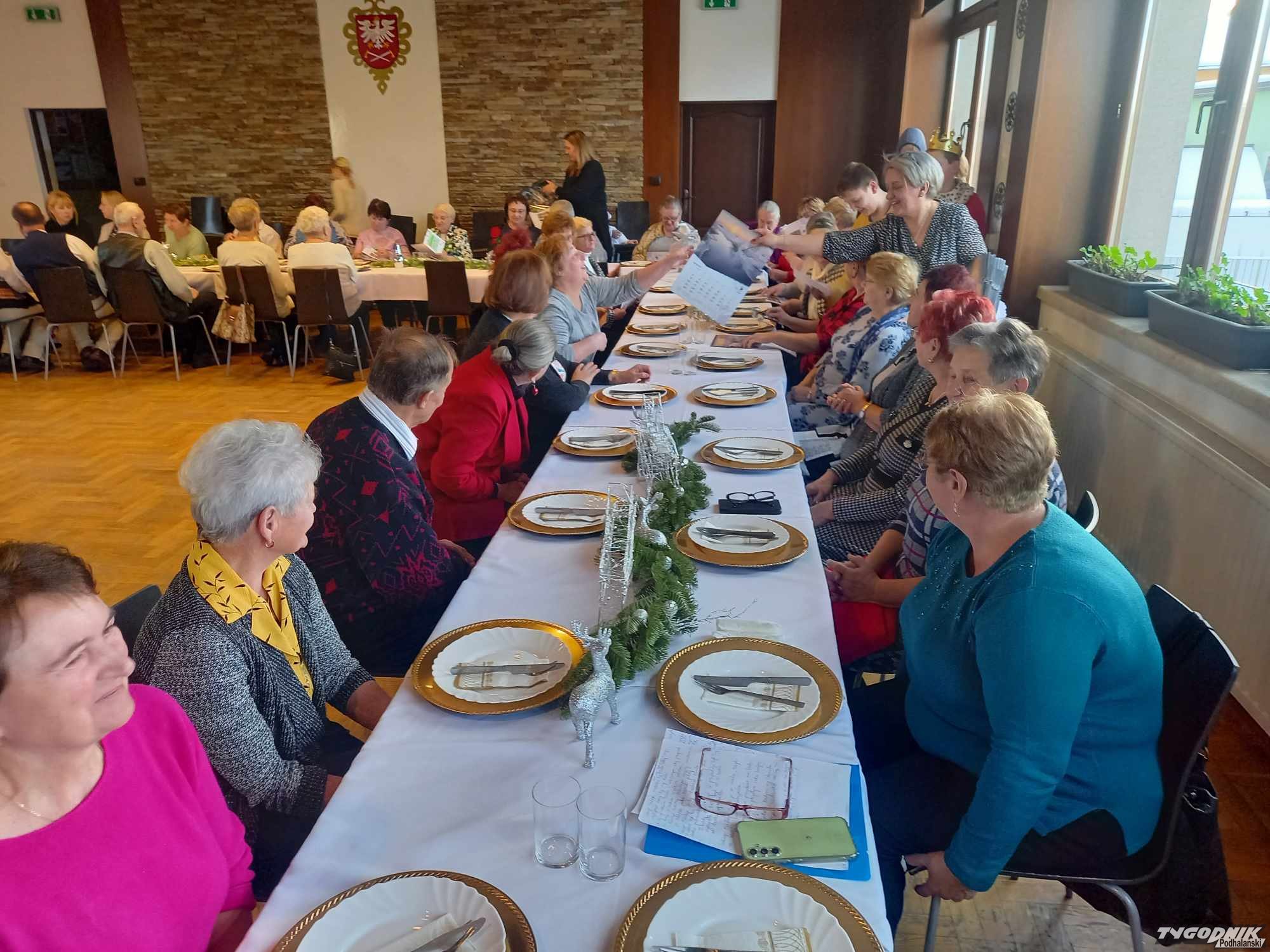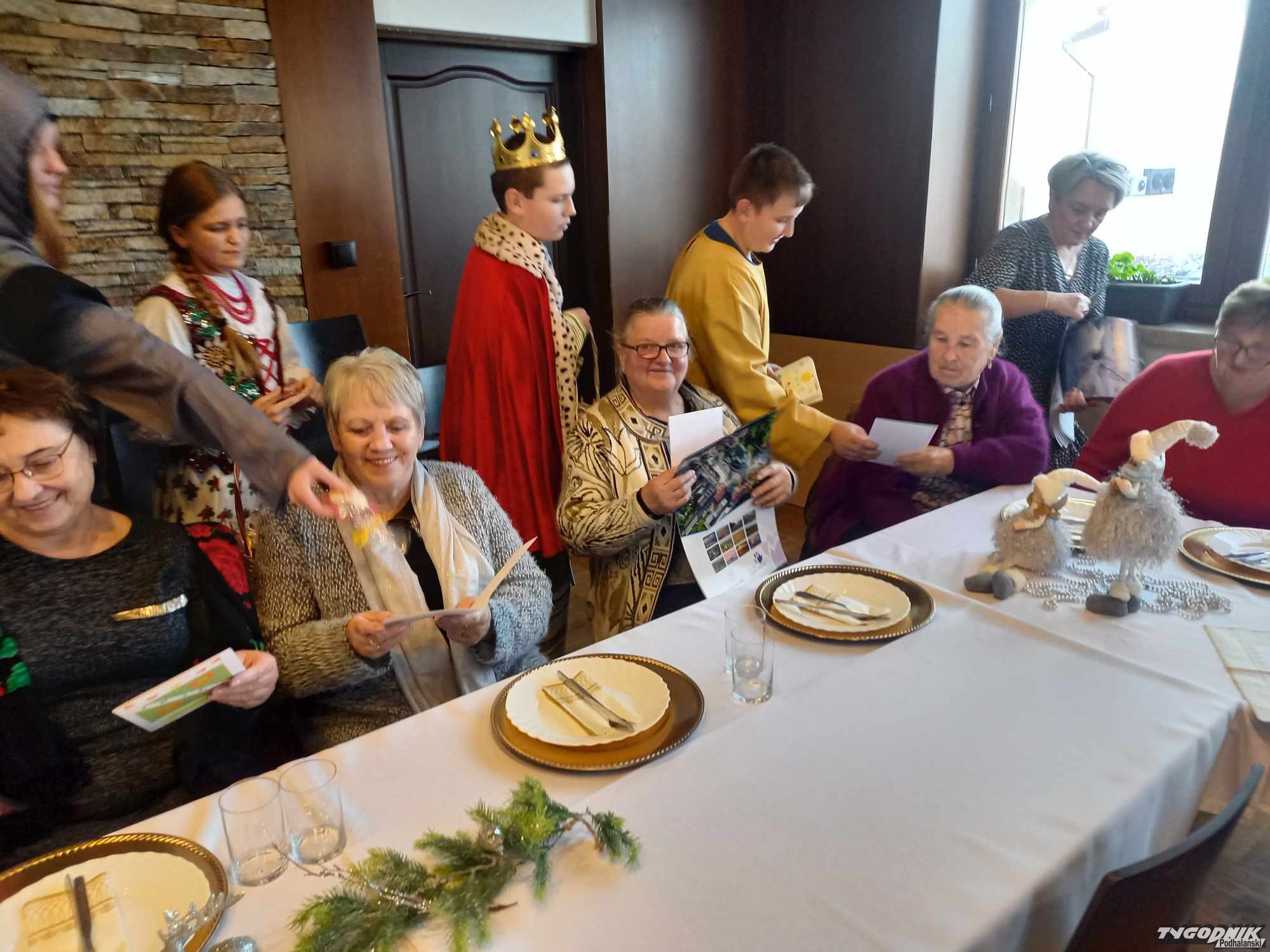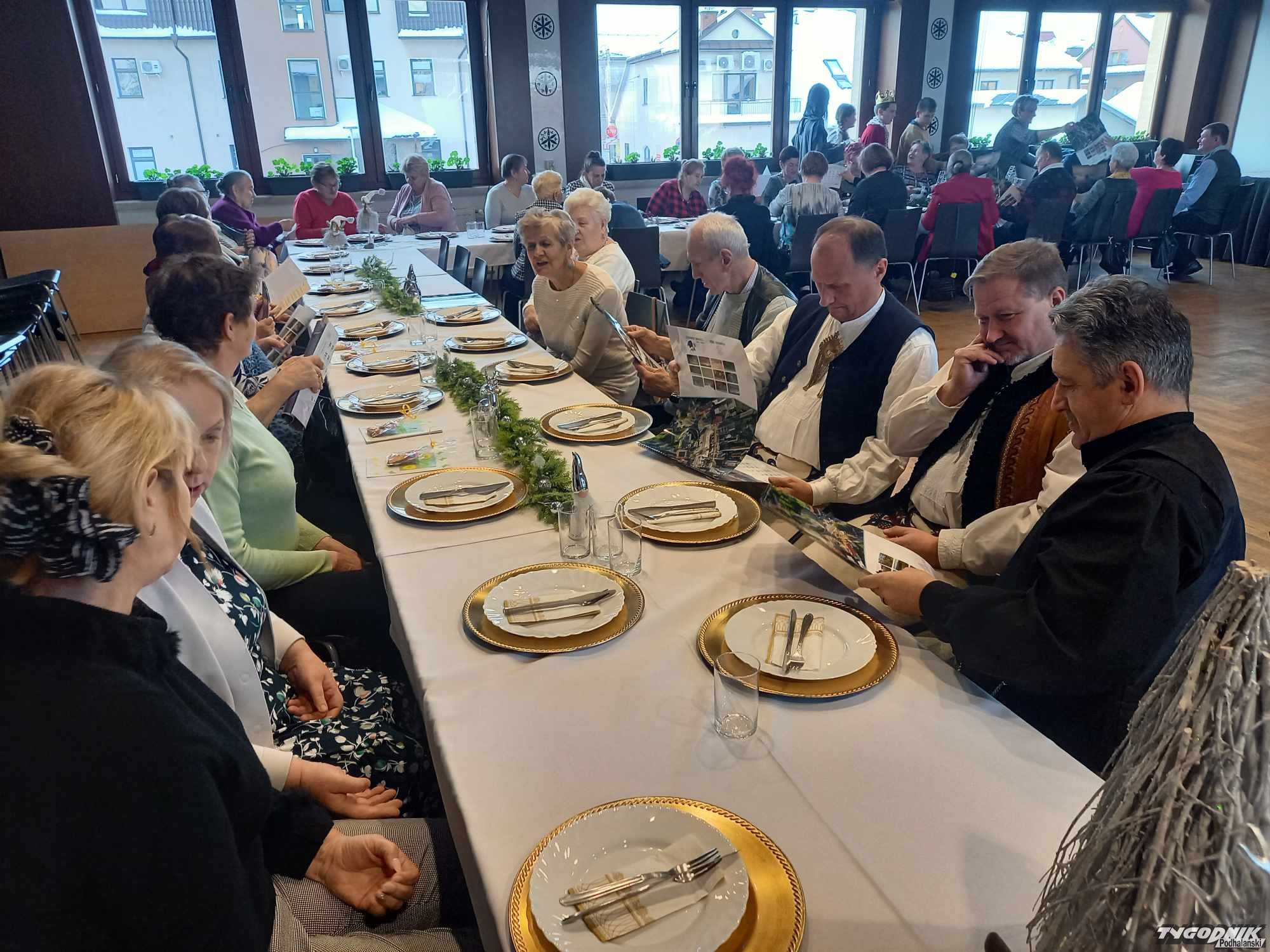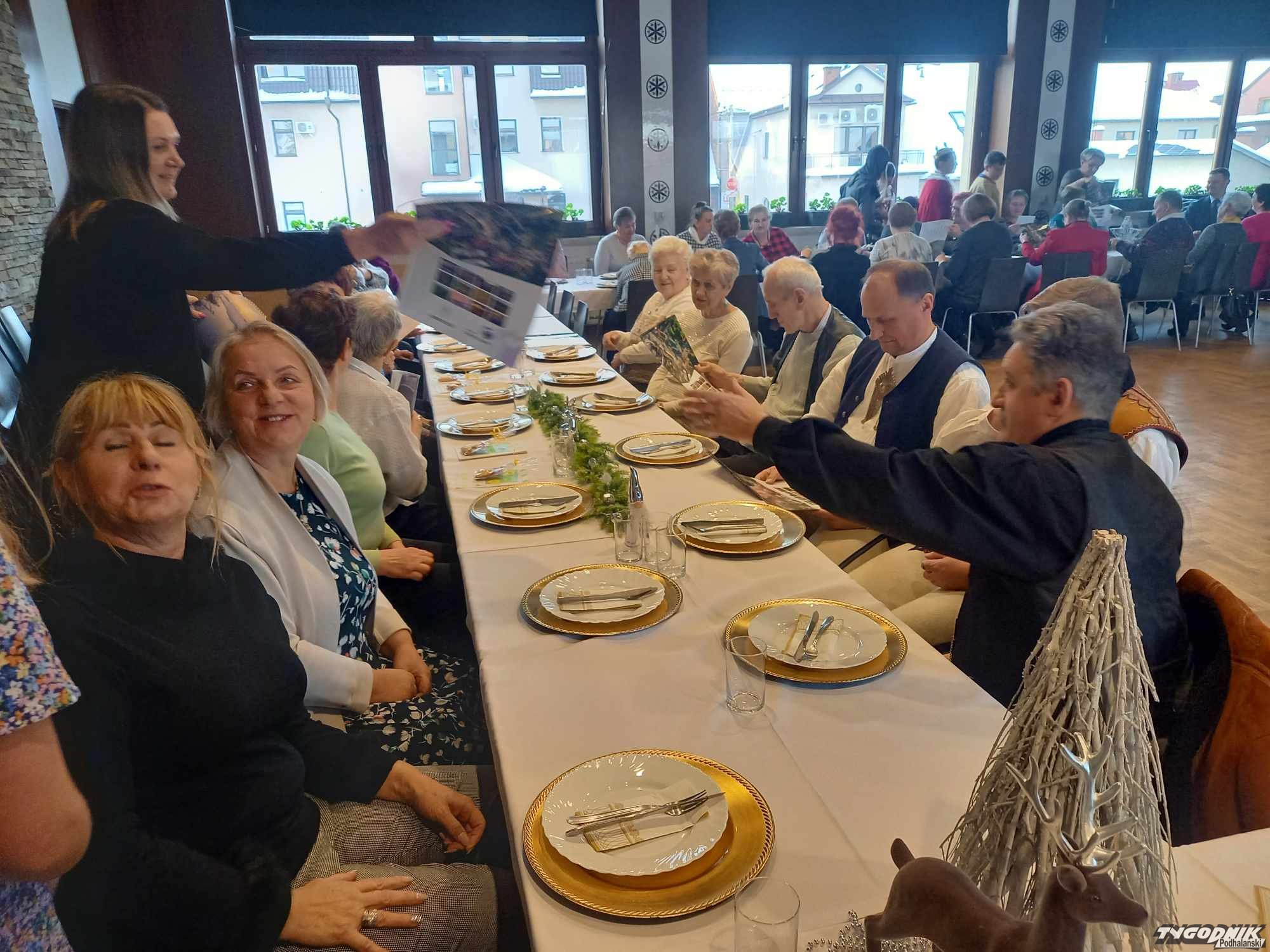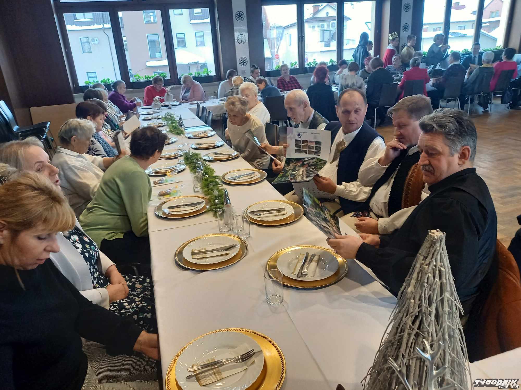 Po części artystycznej pracownicy GOPS wraz z dziećmi rozdali seniorom okolicznościowe upominki. Następnie wszyscy zostali zaproszeni na poczęstunek. Nie zabrakło również kapeli góralskiej, która świętującym umiliła czas. Po konsumpcji seniorzy wspólnie z kapelą góralską zaśpiewali znane piosenki, recytowali napisane przez siebie wiersze i opowiadania z życia społeczności senioralnej.