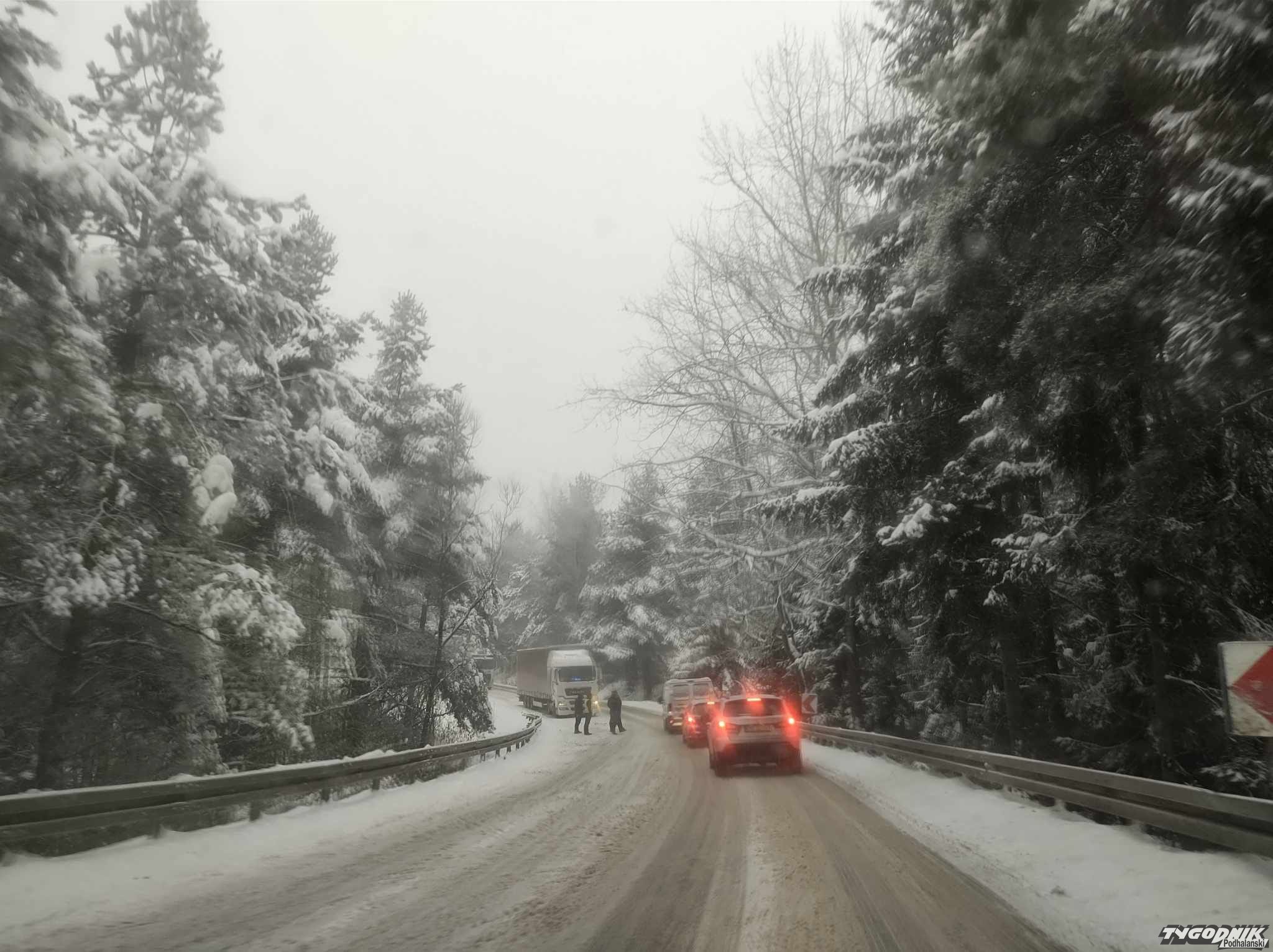 Zima znów zaskoczyła drogowców. Tragiczna sytuacja na drodze od Nowego Targu w kierunku Nowego Sącza