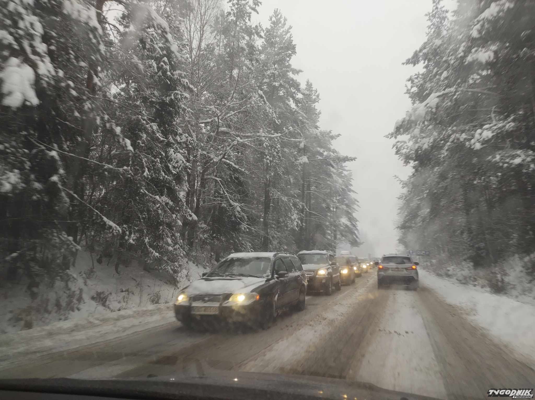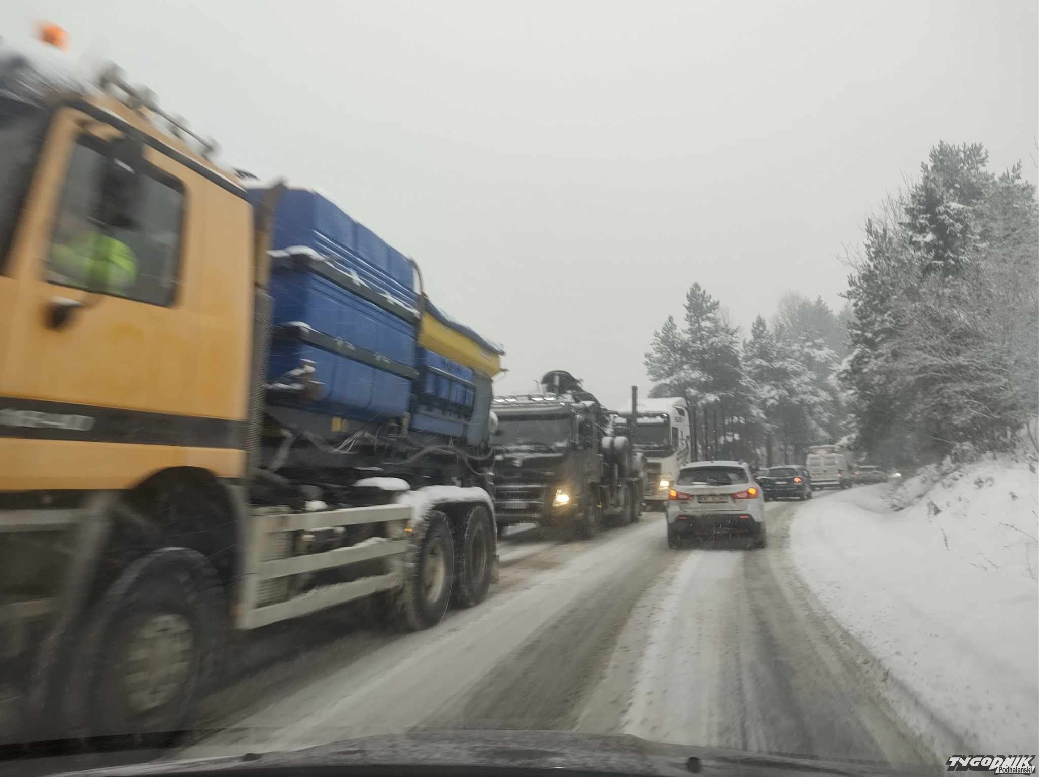 Droga wojewódzka Nowy Sącz-Nowy Targ nie jest odśnieżona. Piaskarka stoi w korku.