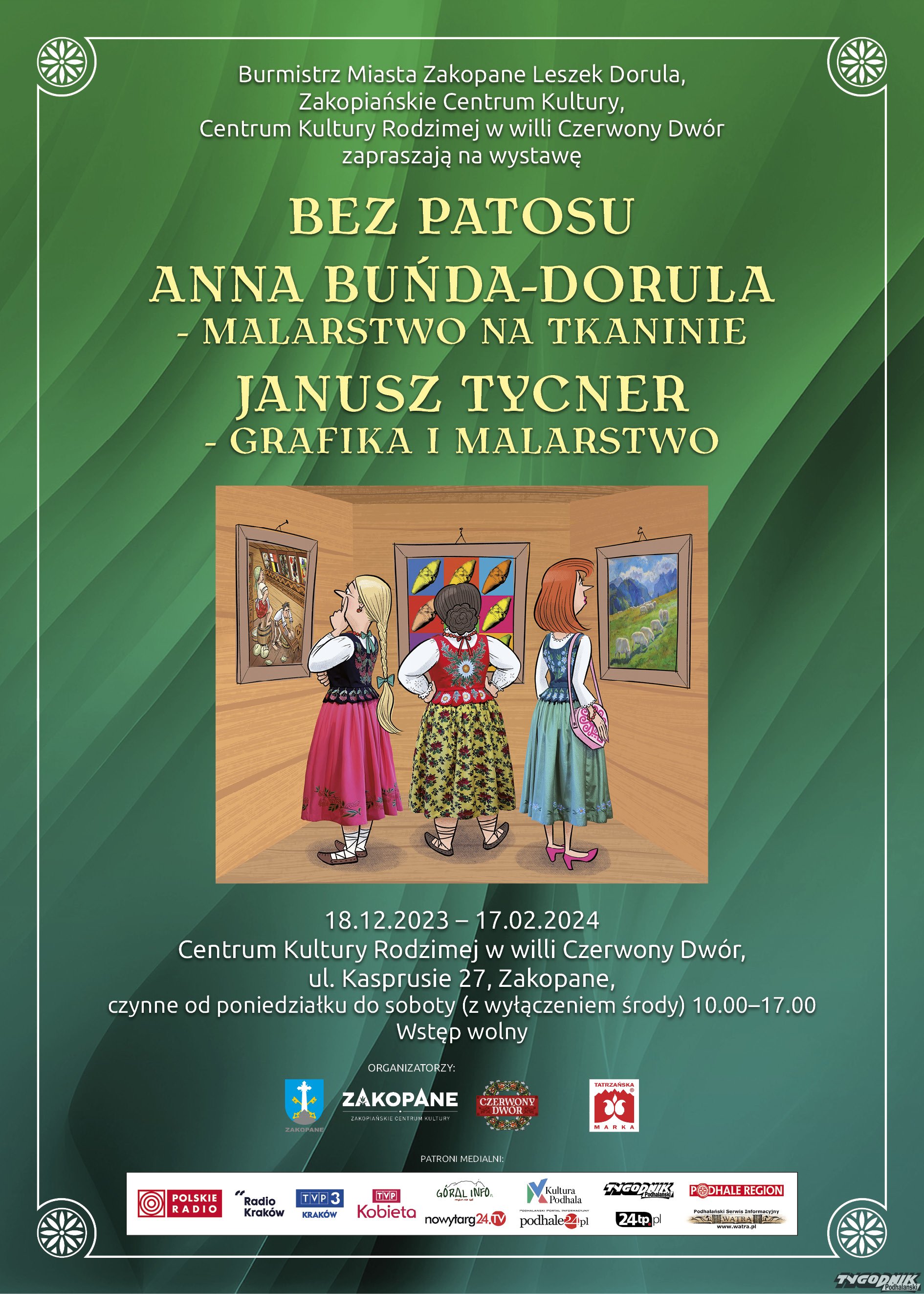Ich wspólna wystawa "Bez patosu. Anna Buńda-Dorula - malarstwo na tkaninie. Janusz Tycner - grafika i malarstwo" otwarta zostanie w willi Czerwony Dwór w Zakopanem w sobotę 16.12 o godzinie 17. Na wernisaż zapraszają wspólnie Zakopiańskie Centrum Kultury i Centrum Kultury Rodzimej w willi Czerwony Dwór.
